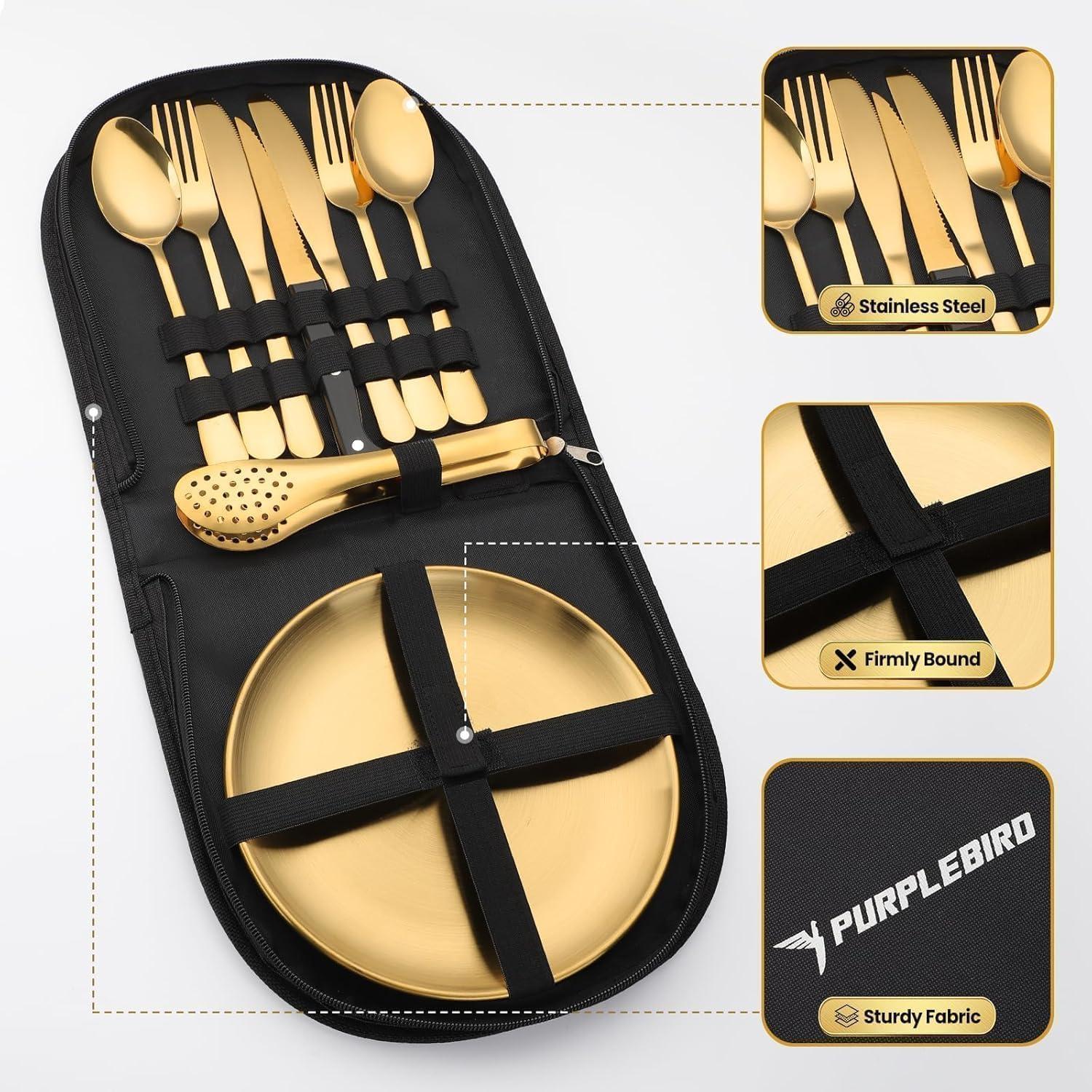 Das Purplebird Besteck Set Gold ist unverzichtbar für Camping-Enthusiasten und Naturfreunde. Das Set beinhaltet 2 Gabeln, 2 Löffel, 2 Tafelmesser, 1 Steakmesser, 2 8-Zoll-Edelstahlteller, 1 Steakzange und eine praktische Aufbewahrungstasche. Alles, was Sie für eine Mahlzeit im Freien benötigen, in einem handlichen Etui.