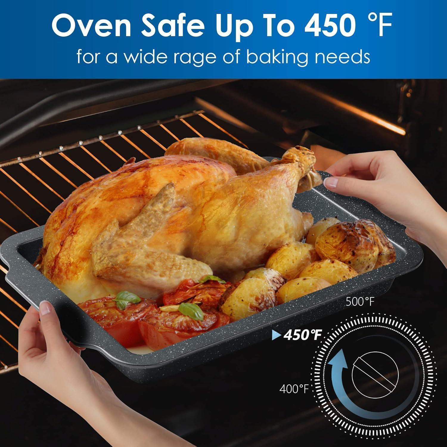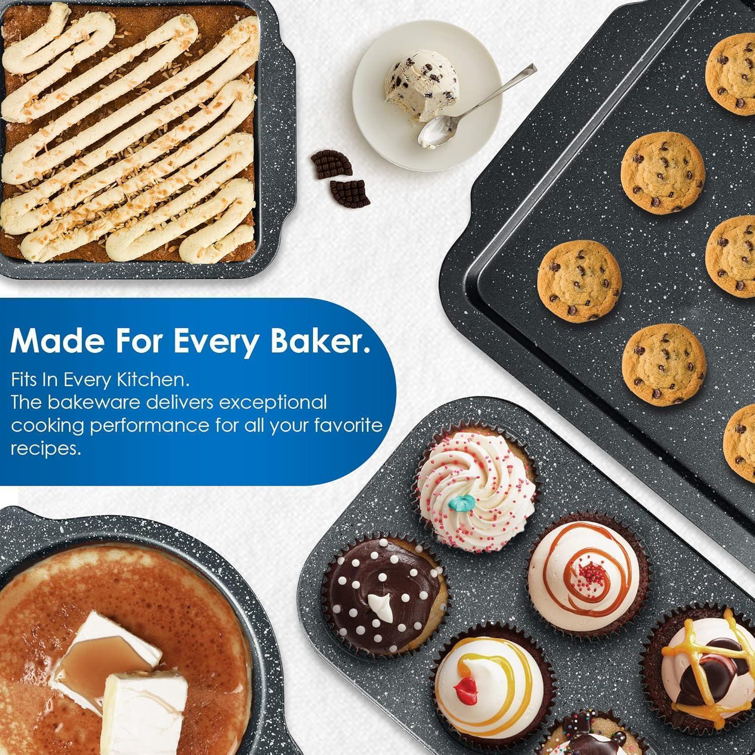 ????Backbleche für den Backofen: Alle 7 Teile unseres Backzubehörs sind hitzebeständig, selbst bei hohen Temperaturen von bis zu 230°C (446 ̊F), wodurch sich das Set für eine Vielzahl von Backanforderungen eignet. Kreieren Sie die köstlichsten Schokoladenpuddings, Schokoladenkekse, Käsekuchen, Apfelkuchen, Brownies, Geburtstagskuchen und vieles, vieles mehr.