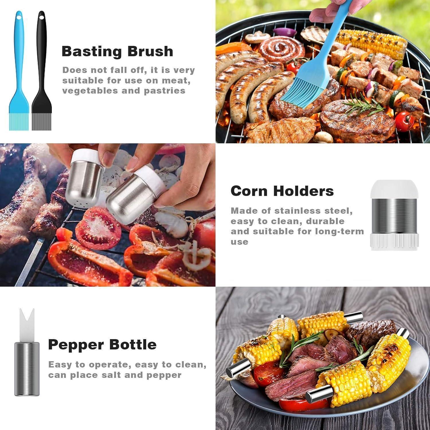Die Grillwerkzeuge werden in einer tragbaren und langlebigen Tragetasche aufbewahrt, die einfacher zu tragen ist als ein Aluminiumkoffer. Das Set beinhaltet ein Thermometer, eine Grillmatte, eine BBQ-Zange, eine BBQ-Spachtel, eine BBQ-Gabel (lang), zwei Ölpinsel, eine Drahtbürste, vier Kabob-Spieße, acht Maishalter, zwei Gewürzflaschen, zwei Fleischkrallen und eine Aufbewahrungstasche. Mit diesem umfangreichen Set sind Sie bestens ausgestattet für jede Grillparty oder Campingausflug.