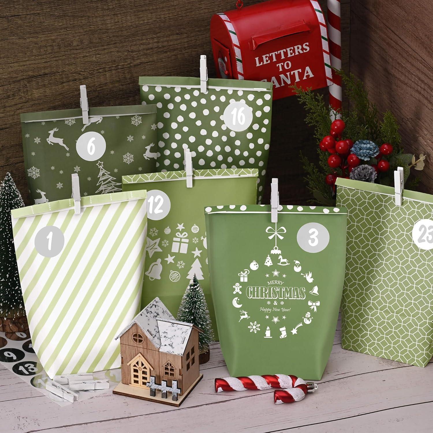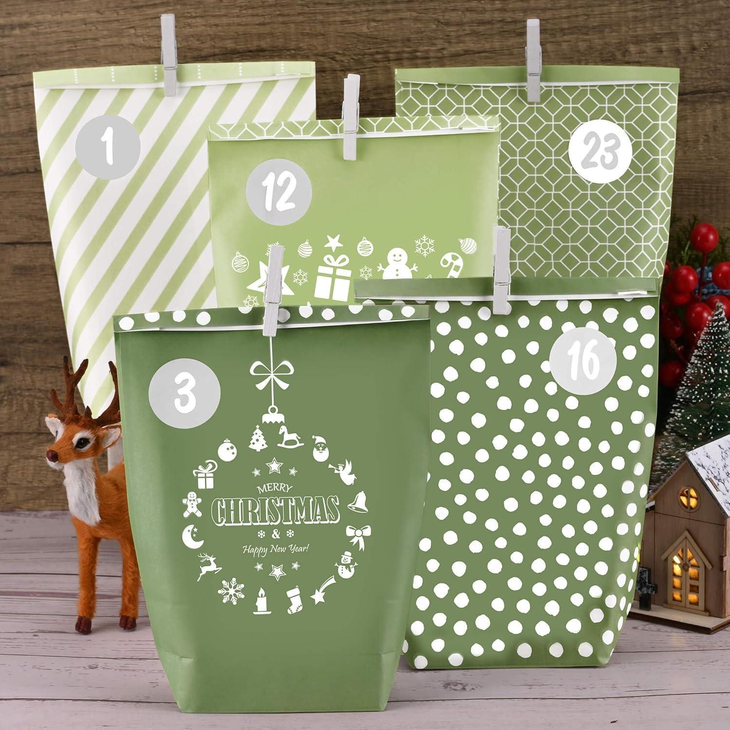Stilvoller Adventskalender: Enthält 24 bedruckte Papierbeutel mit passenden Klammern und Aufklebern