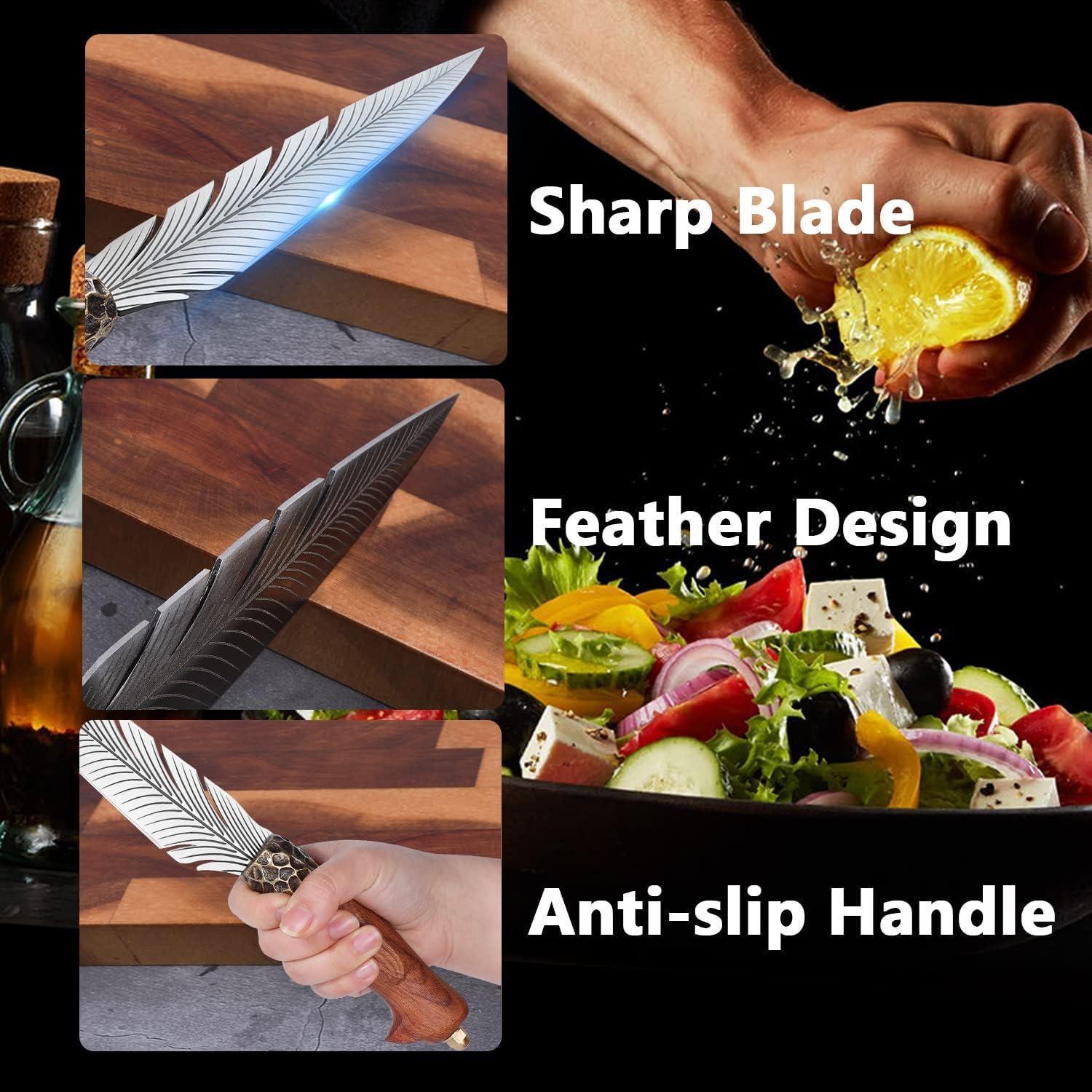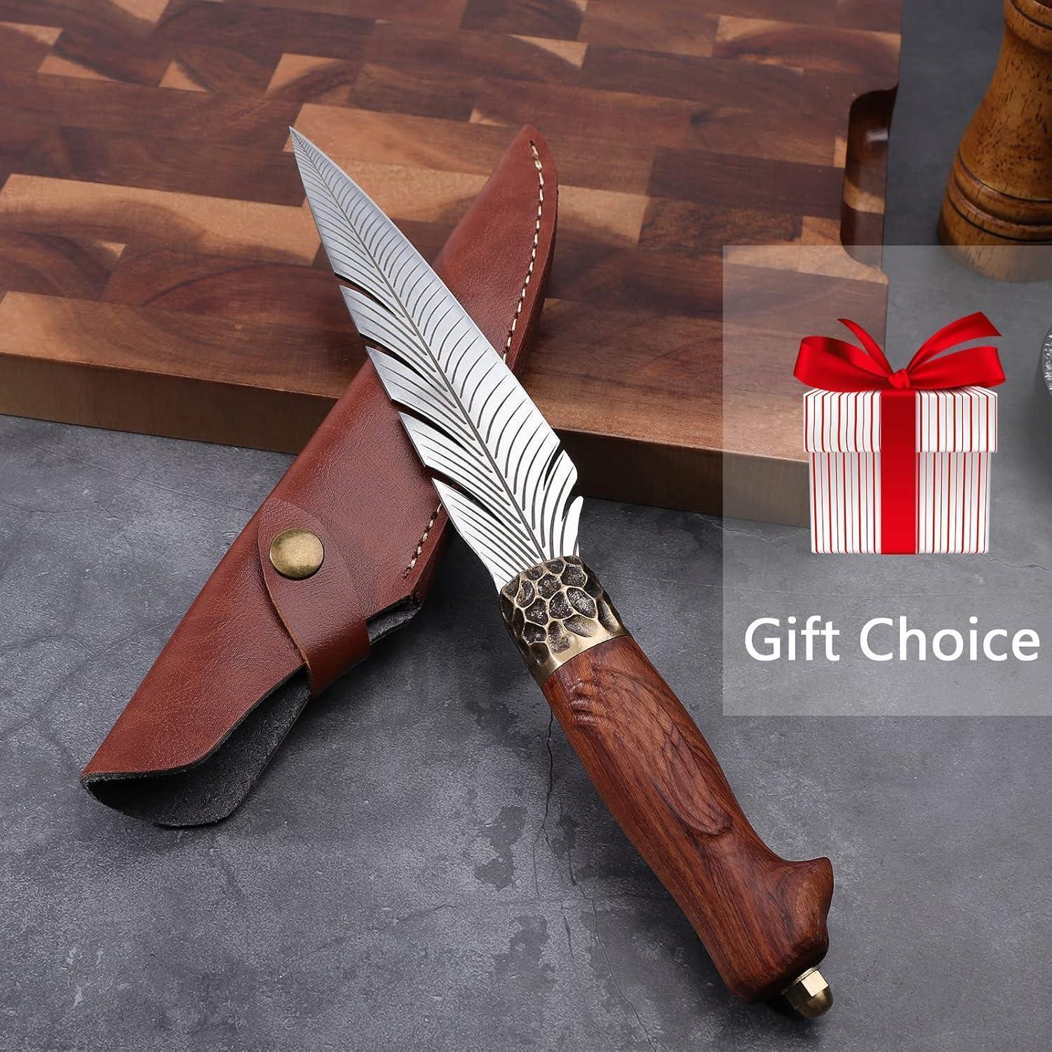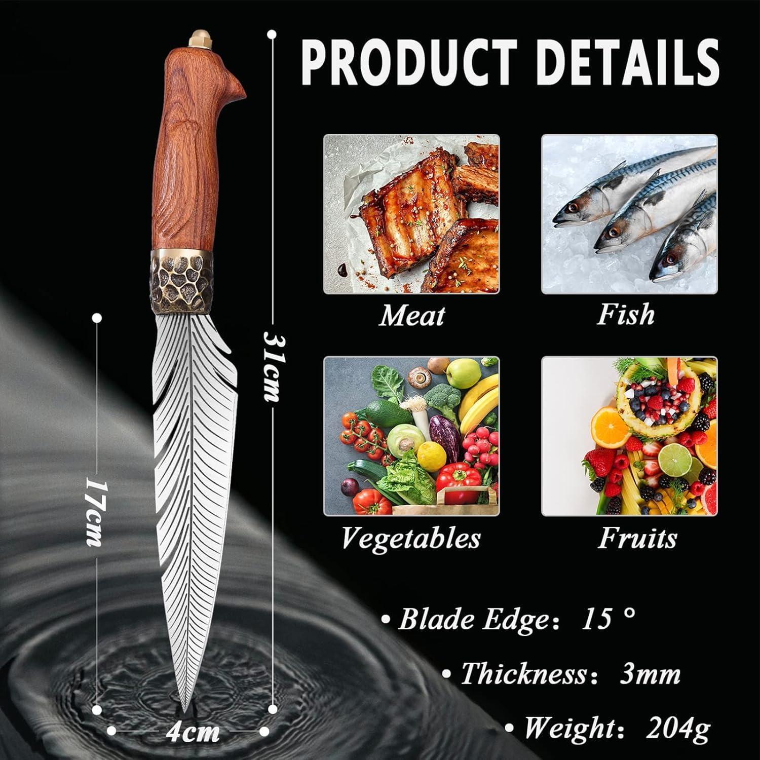 Handgeschmiedetes Japanisches Kochmesser mit Lederhülle, Scharfes Ausbeinmesser mit Holzgriff Outdoor Messer, Kohlenstoffstahl Küchenmesser Hackmesser Messer Kollektion - Dieses handgeschmiedete Ausbeinmesser wird Sie begeistern, denn Sie haben genug von den immer gleichen Küchenmessern. Inspiriert von Schutzengeln sind Federn auf der Klinge eingraviert, die Schutz, Glück und Heilung symbolisieren.
