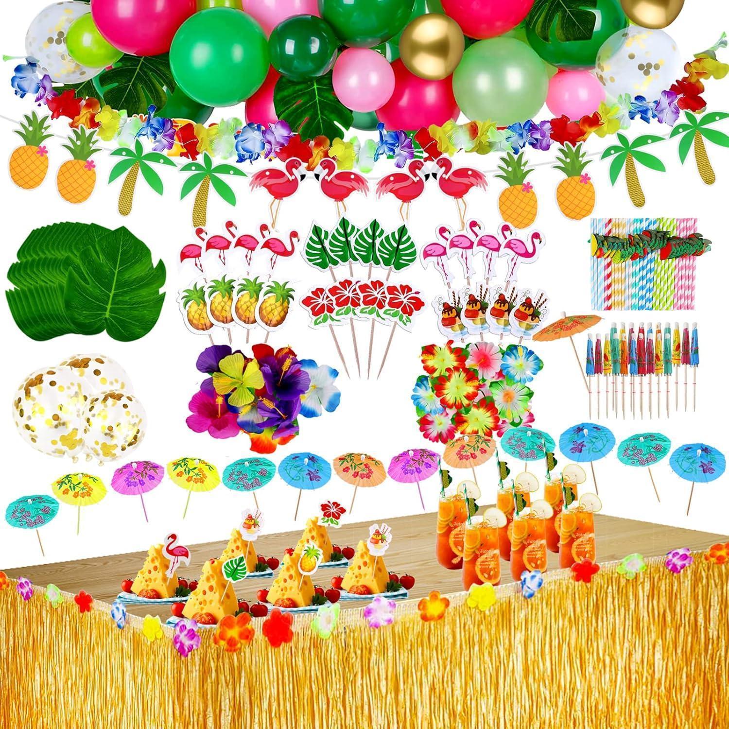 Das 146-teilige Hawaii Party Dekoration Set ist die perfekte Ergänzung für Ihre Beachparty, Hawaii Luau oder Aloha Party. Das Set beinhaltet einen Hawaii Tischrock, künstliche Palmblätter, hawaiianische Blumen, Regenschirme, Frucht-Papierstrohhalme, Zahnstocher, Luftballons, Klettverschlüsse, eine Hawaii Kette mit Flamingo und eine Hawaii Kette mit Blumen.