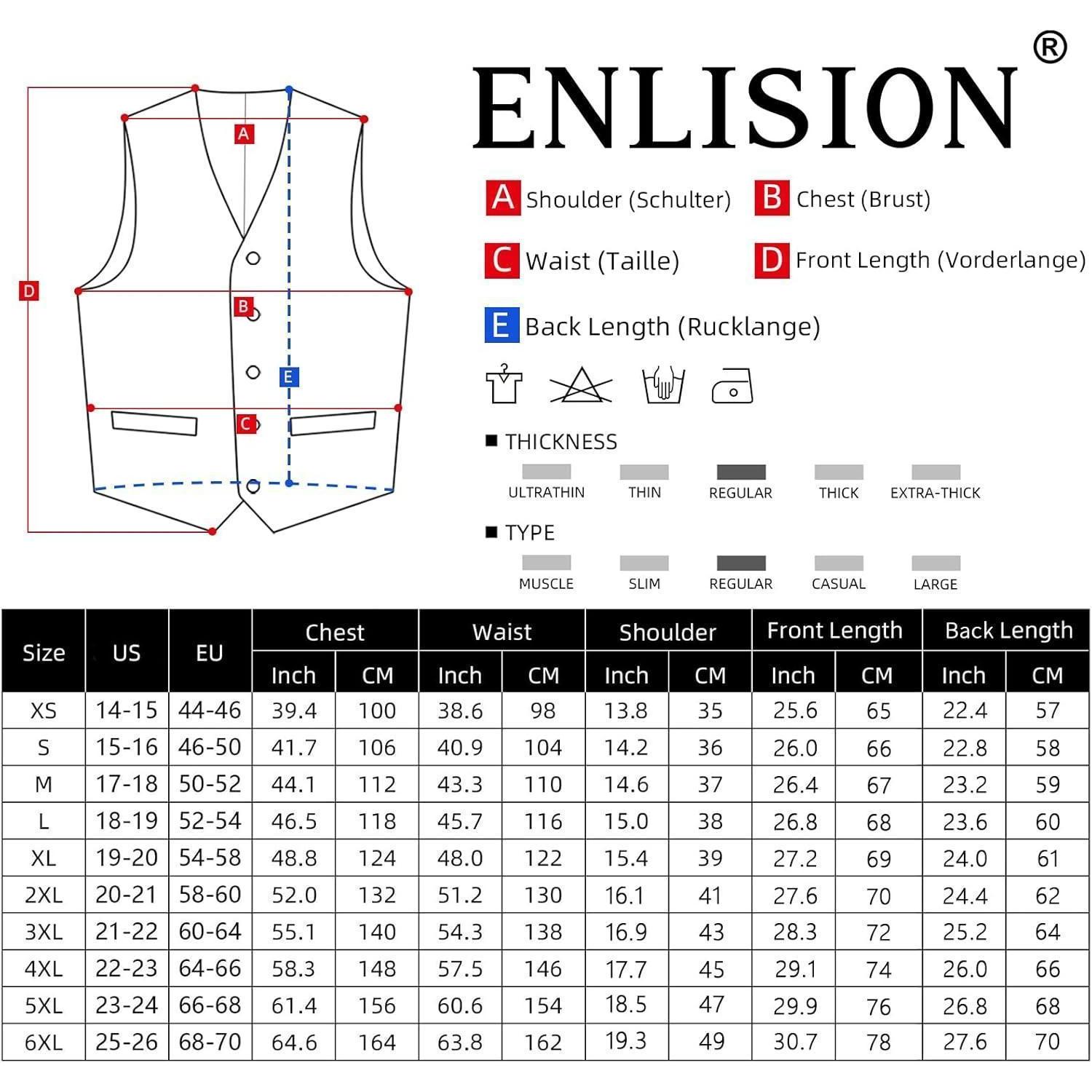Die Enlision Anzugweste für Herren ist eine elegante und stilvolle Ergänzung zu jeder Garderobe. Das Set beinhaltet eine Weste, eine Krawatte und ein Einstecktuch, perfekt geeignet für verschiedene Anlässe wie Hochzeiten, Partys, Bankette, Geschäftstermine und mehr.
