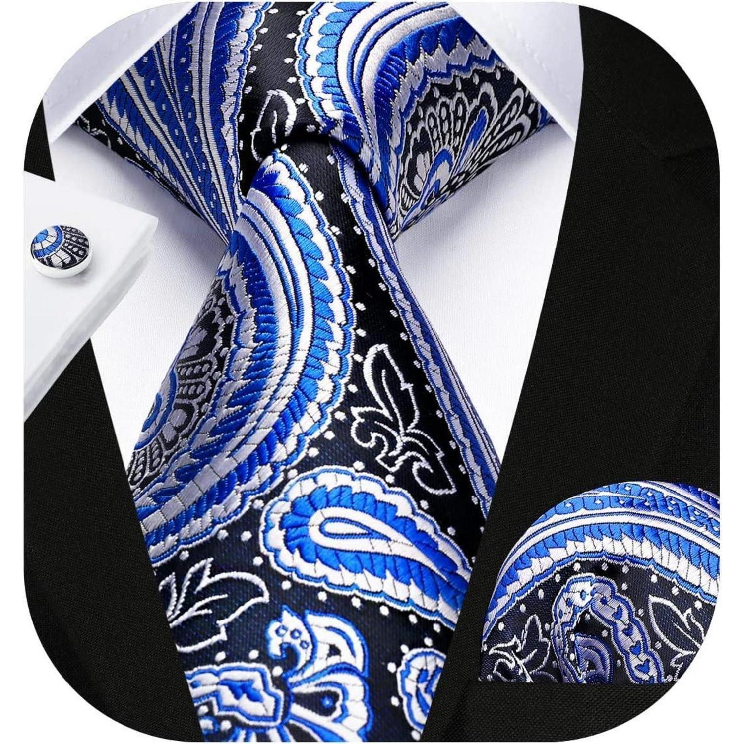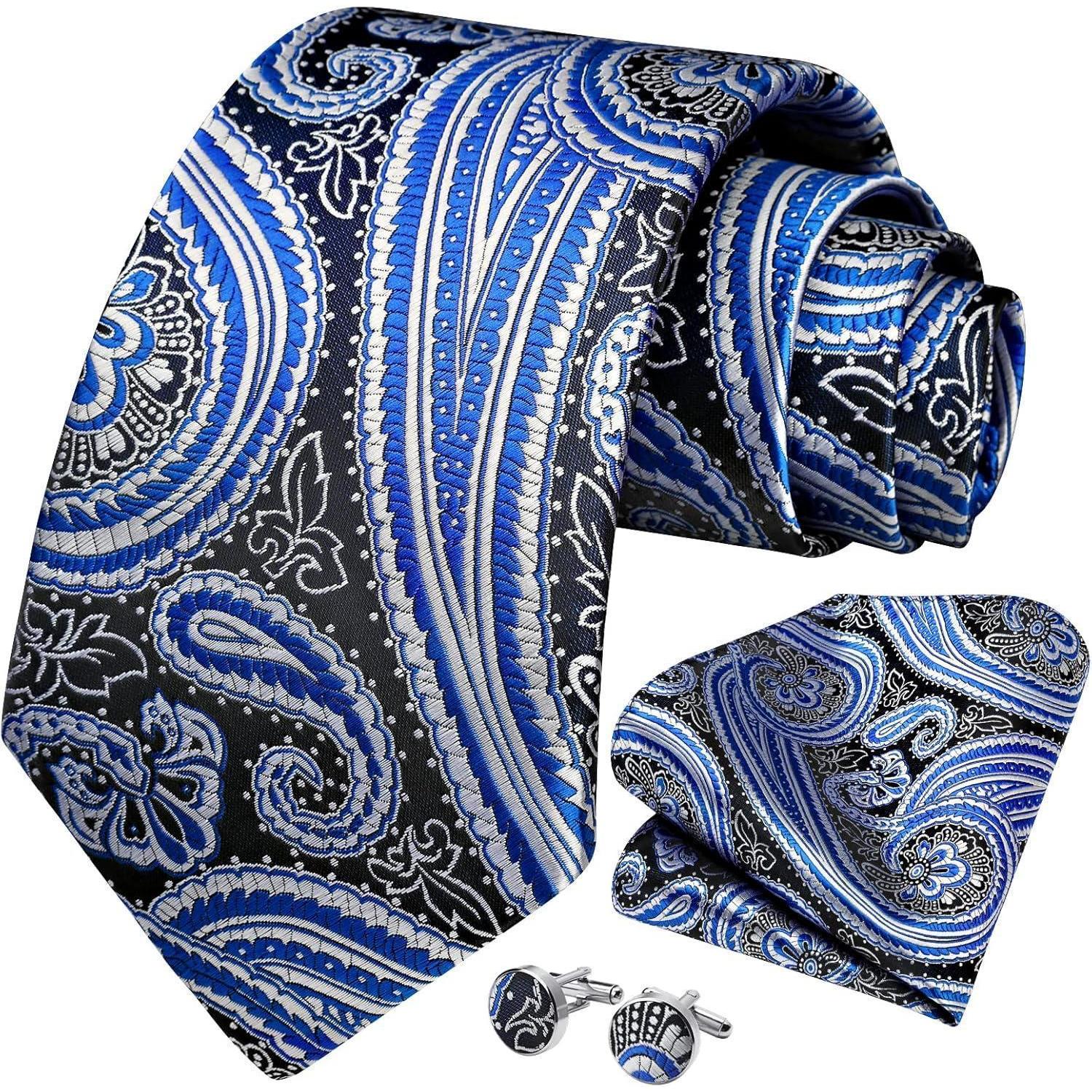 Entdecken Sie mit der HISDERN Herren Krawatte Paisley mit Krawatte & Einstecktuch Manschettenknopf Set die Vielseitigkeit und Eleganz eines zeitlosen Accessoires, das Ihren Look aufwertet und Ihnen einen Hauch von Klasse verleiht. Machen Sie sich bereit für bewundernde Blicke und Komplimente, wenn Sie diese Krawatte tragen.