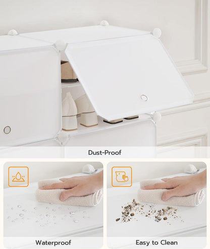 Der Schuhschrank besteht aus hochwertigem Kunststoff, der wasserdicht ist und sich leicht mit einem Handtuch abwischen lässt, um ihn zu reinigen. Die Belüftungstüröffnungen sorgen für eine gute Luftzirkulation und verhindern unangenehme Gerüche in Ihren Schuhen.