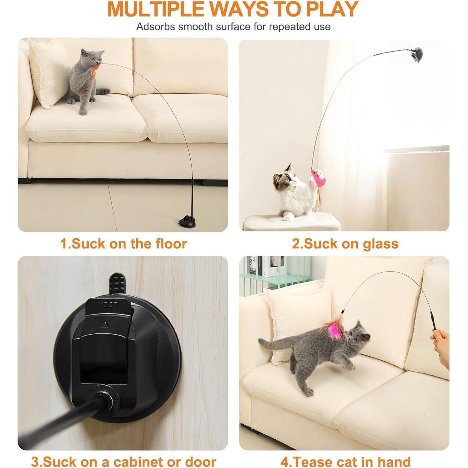Das Set enthält 9 Ersatzspielzeuge, 2 starke Saugnäpfe und 2 Katzenstäbe mit Glocken und Federn in leuchtenden Farben, um die Aufmerksamkeit Ihrer Katze zu erregen. Dies fördert die Agilität Ihrer Katze, stärkt die Verbindung zwischen Tier und Besitzer und baut Vertrauen auf.