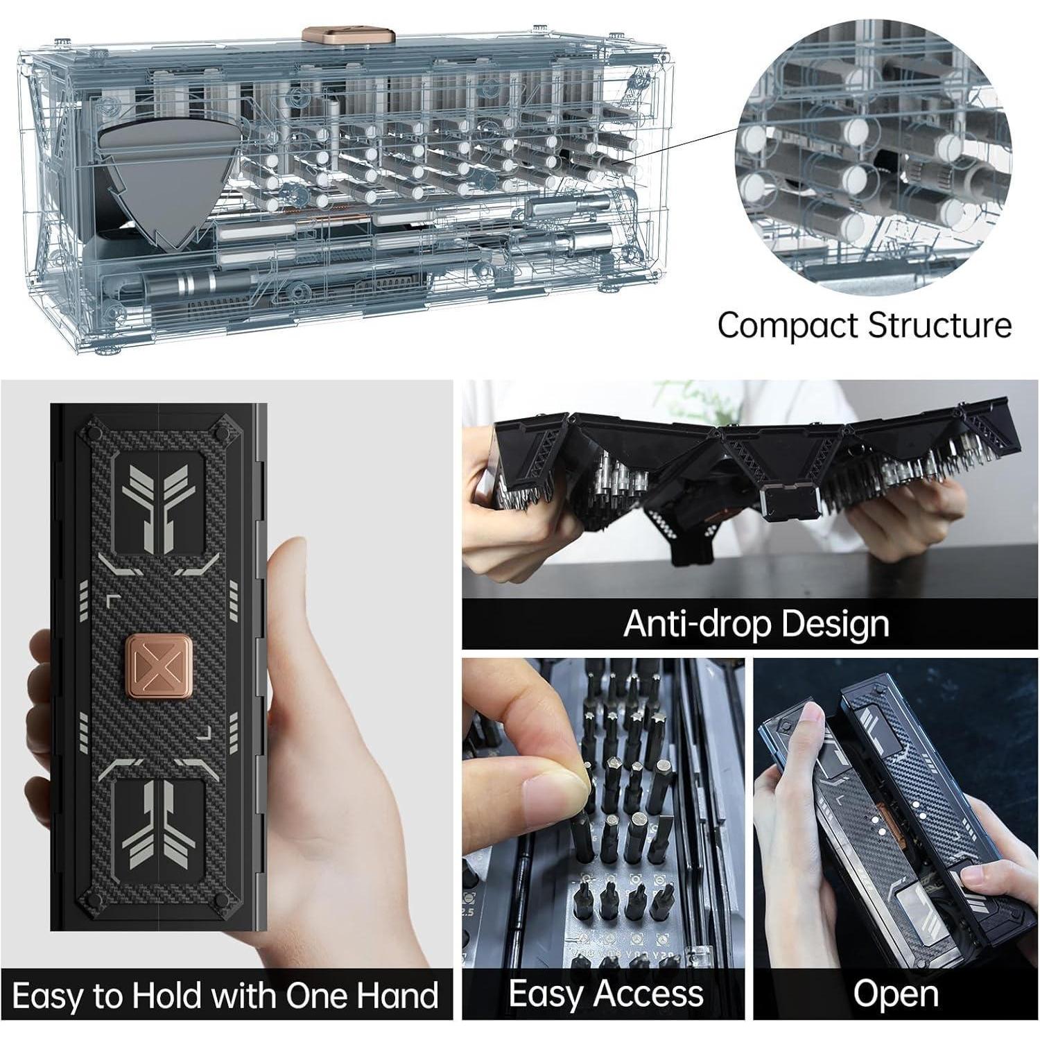 Das JAKEMY 180 in 1 Präzisions-Schraubendreher-Set ist die perfekte Lösung für alle Ihre Reparatur- und Heimwerkerprojekte. Die Bits bestehen aus hochwertigem CRV-Stahl und S2-Stahl, sind magnetisiert und können kleine Schrauben mühelos aufnehmen. Der quadratische Griff sorgt für einen sicheren Halt und verhindert das Rollen auf ebenen Oberflächen.