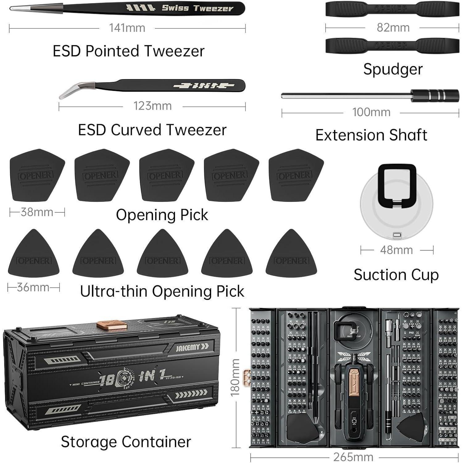 Das Set enthält eine Vielzahl von Bits, einen Schraubendrehergriff, Verlängerungsschäfte, ESD-Pinzetten, Bildschirmspudger, Öffnungs-Plektren, Saugnapf und Bit Adapter. Mit insgesamt 180 Teilen ist dieses Werkzeugset äußerst vielseitig und eignet sich für Reparaturen an Laptops, Computern, Smartphones und vielen anderen elektronischen Geräten.