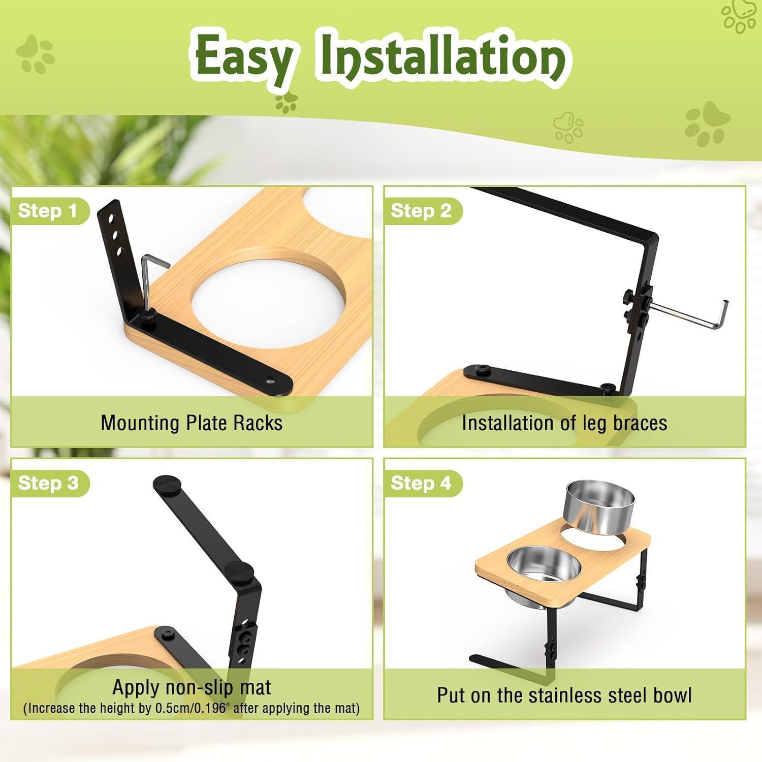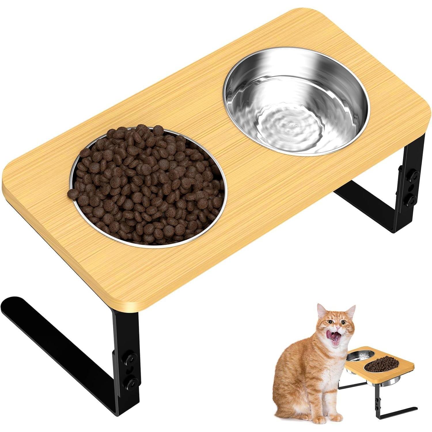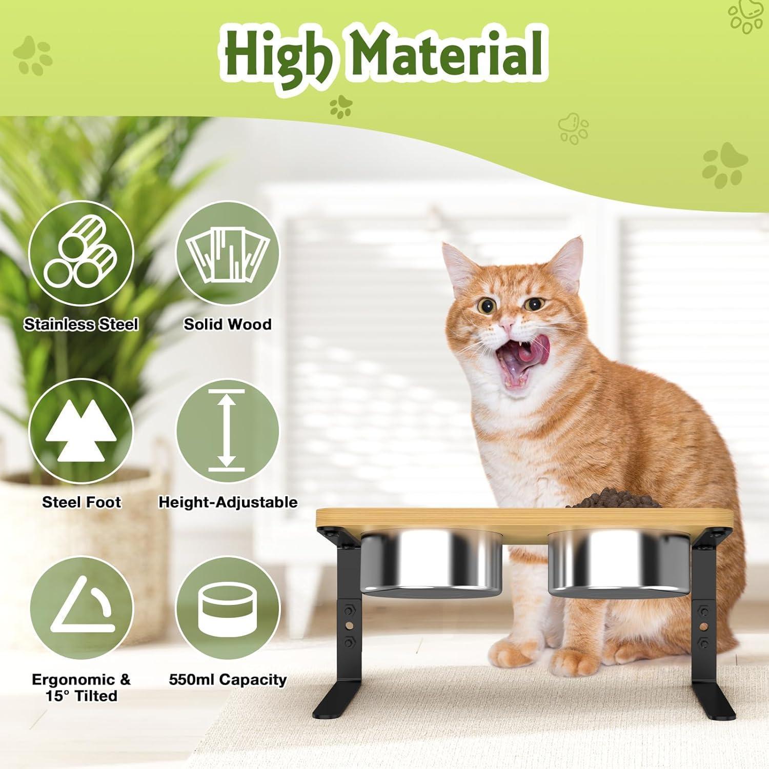 Der hochwertige und langlebige Napfständer aus Holz ist mit einer Bambus- und Metallhalterung sowie 2 rostbeständigen, abnehmbaren Edelstahlnäpfen ausgestattet - perfekt für Futter und Wasser. Die Anti-Rutsch-Pads an den Beinen sorgen für Stabilität und verhindern ein Verrutschen während des Fressens.