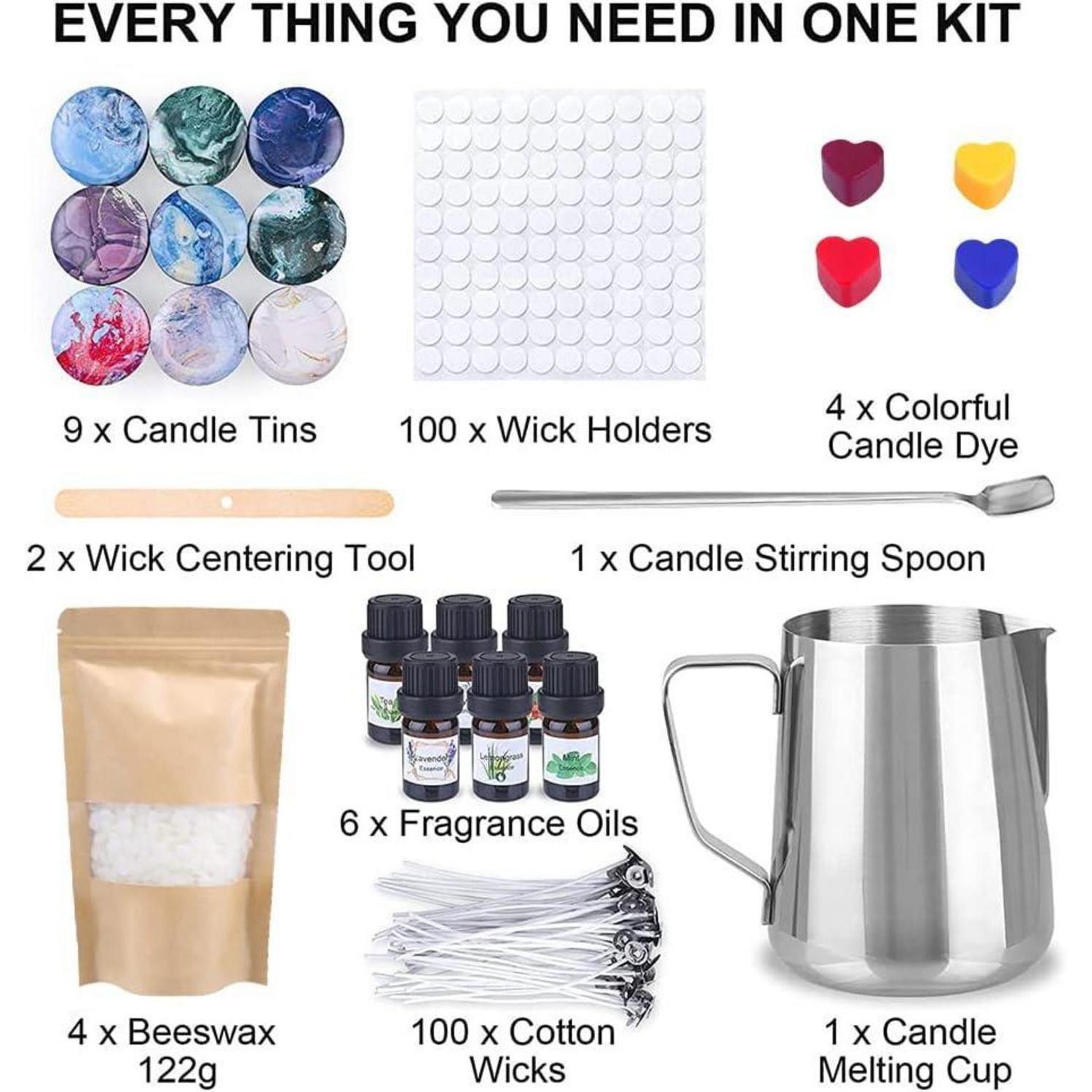 Komplettes Kerzen Selber Machen Set Starter-Set: Alle Zubehörteile zur Personalisierung Ihrer Kerzen sind in diesem Paket enthalten. Es beinhaltet 4x120g Bienenwachs, 6x ätherisches Öl (Teebaum, Eukalyptus, Orange, Lavendel, Zitronengras, Minze), 100 x Baumwolldochte, 100 x Dochtaufkleber, 2 x Dochthalter, 1 x 500 ml Kerzenschmelzkrug, 9 leere Kerzendosen und 1 x Mischrührer.