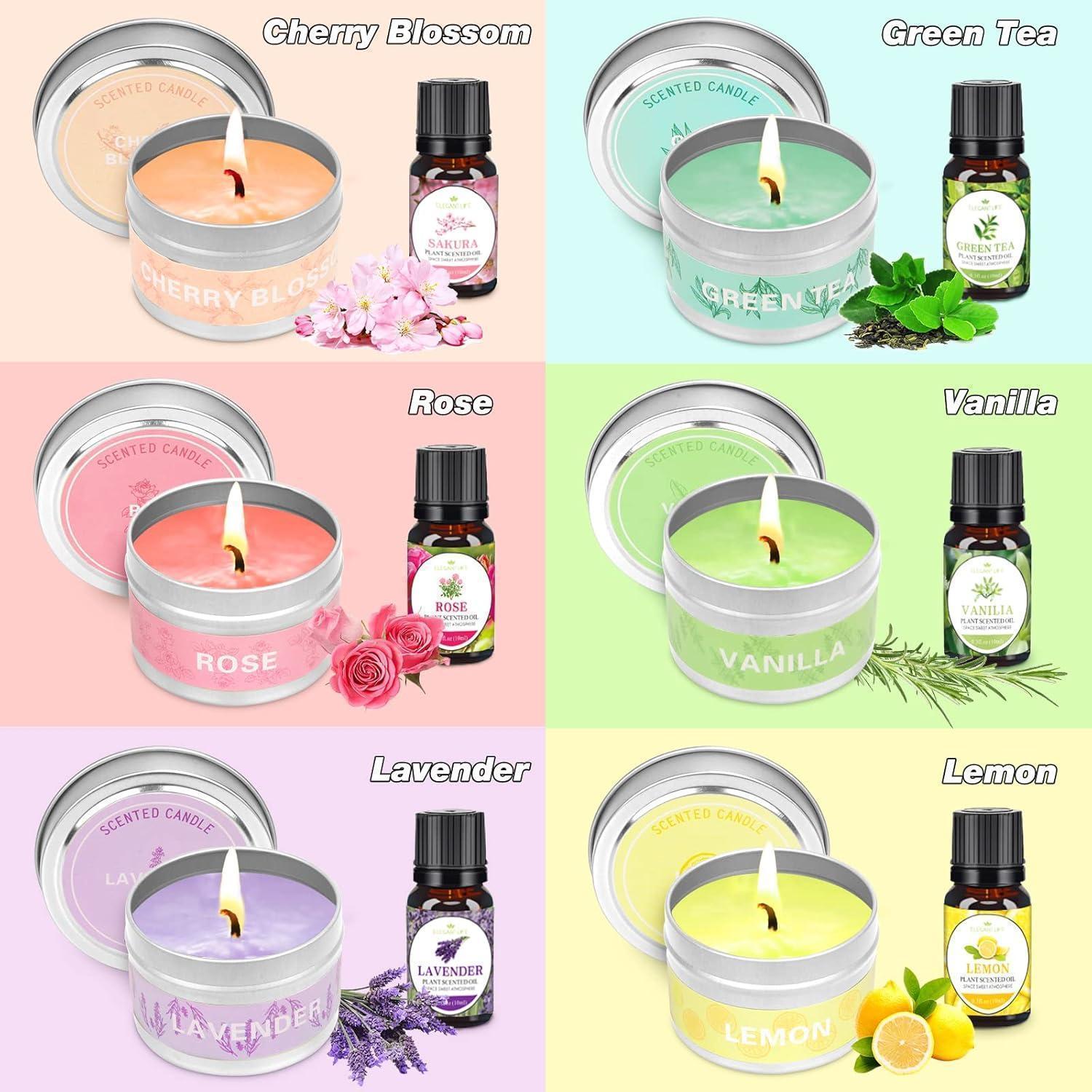 6 natürliche Duftöle: Dieses Duftkerze Geschenkset enthält hochwertige Duftöle wie Lavendel, Rose, Vanille, Grüner Tee, Zitrone und Kirschblüte. Verpackt in versiegelten Beuteln, um Verschüttungen zu vermeiden.