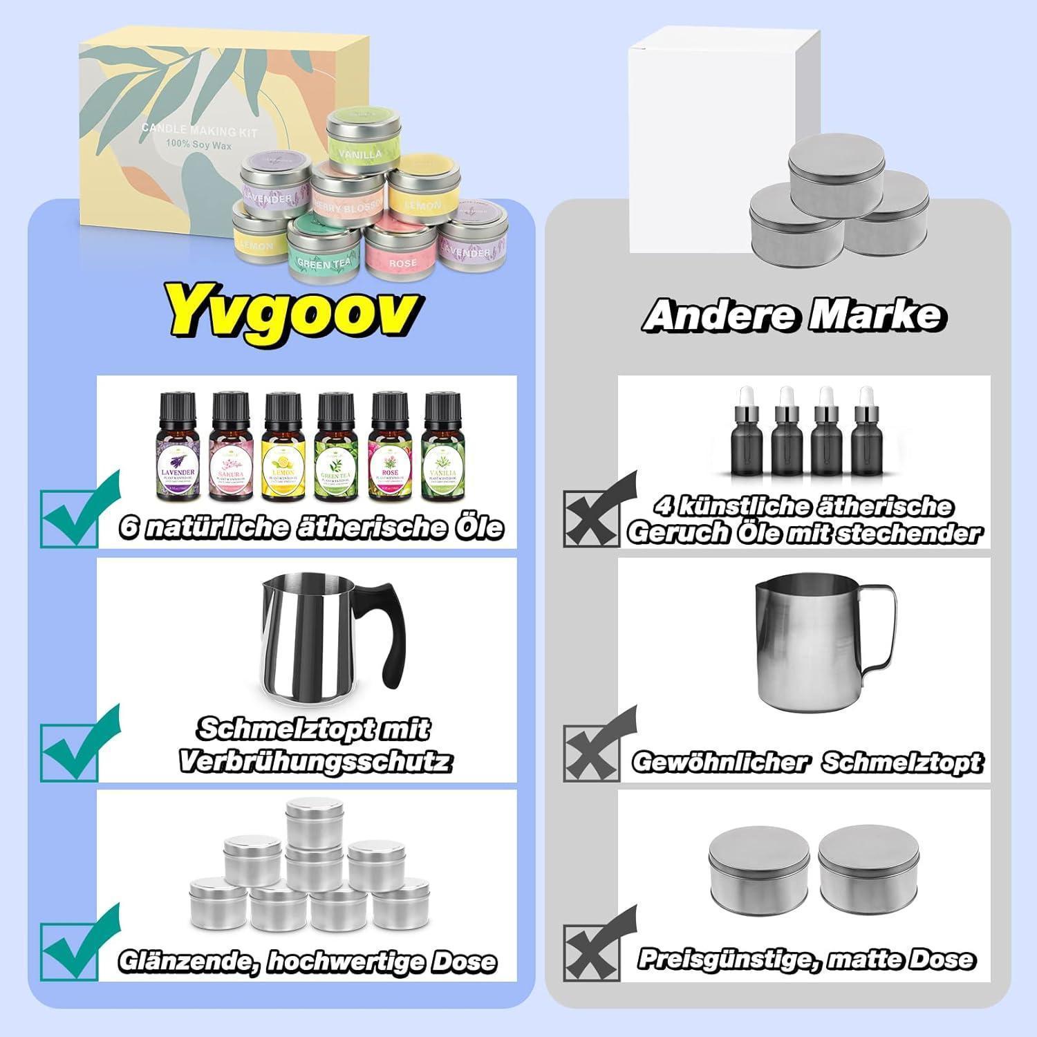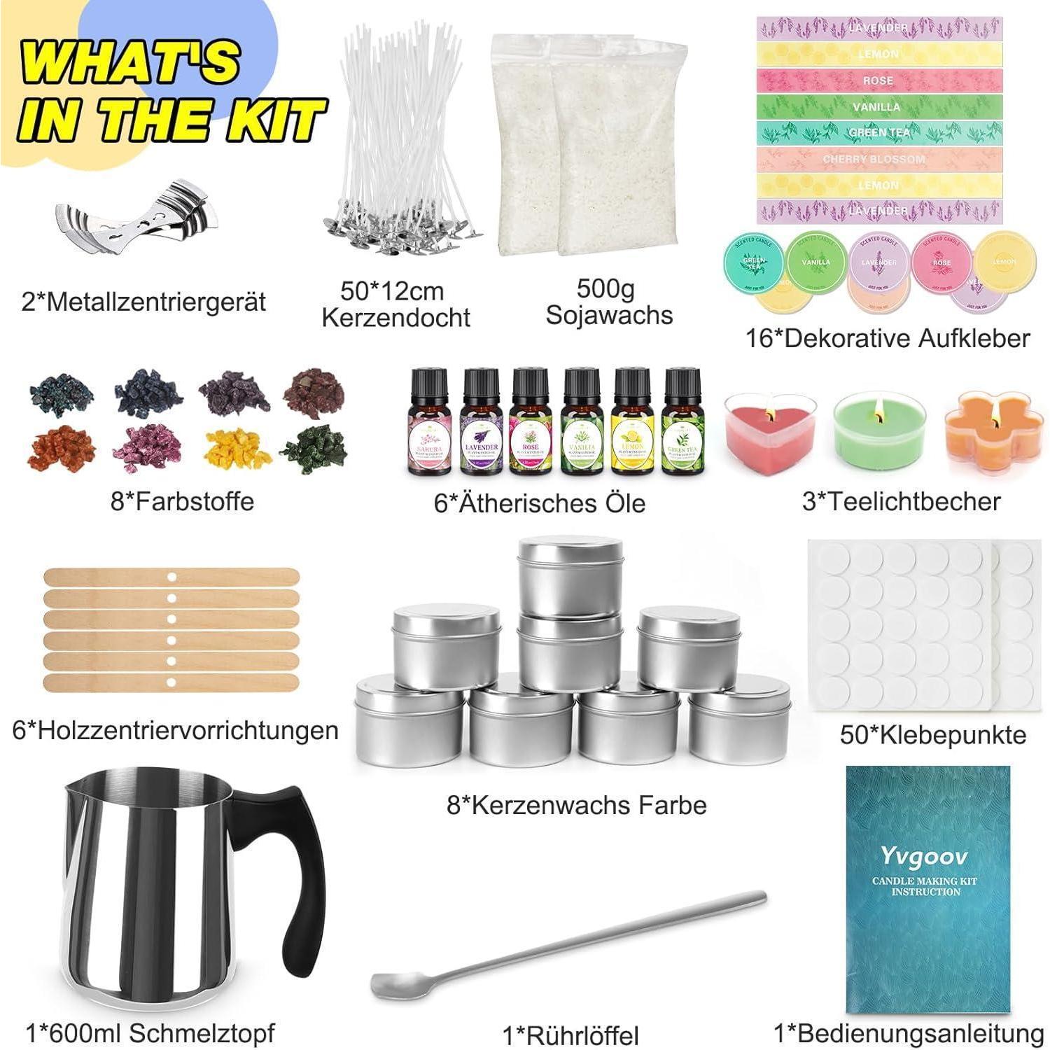 Das ultimative Set für Anfänger: Jedes Kerzen DIY Set ist sorgfältig verpackt und beinhaltet alles, was Sie benötigen - 500g Sojawachs, 8 Kerzendosen, 1 Schmelztopf mit Verbrühungsschutzgriff, 8 Kerzenfarben, Aufkleber, Kerzendocht, Metallzentriergerät, Dochthalter aus Holz, Teelichtbecher, Rührlöffel, Thermometer und eine Bedienungsanleitung.