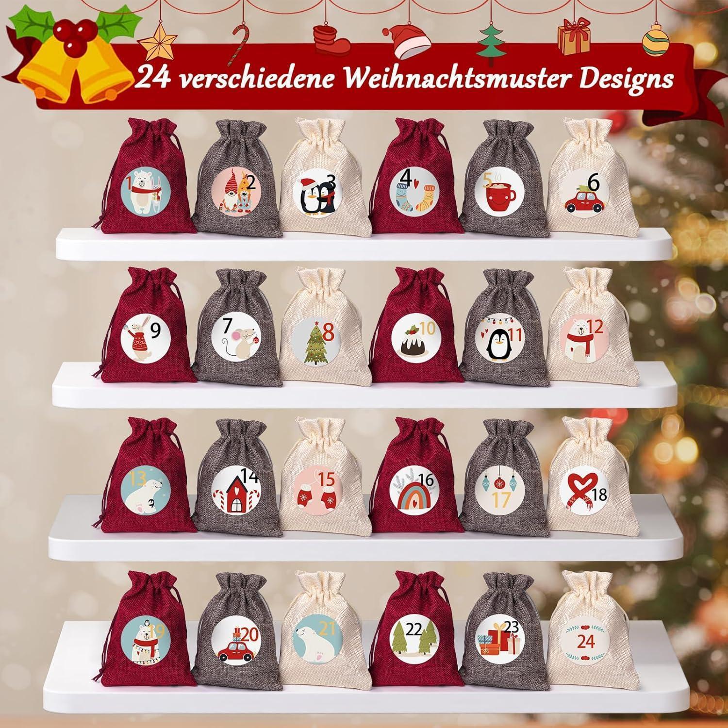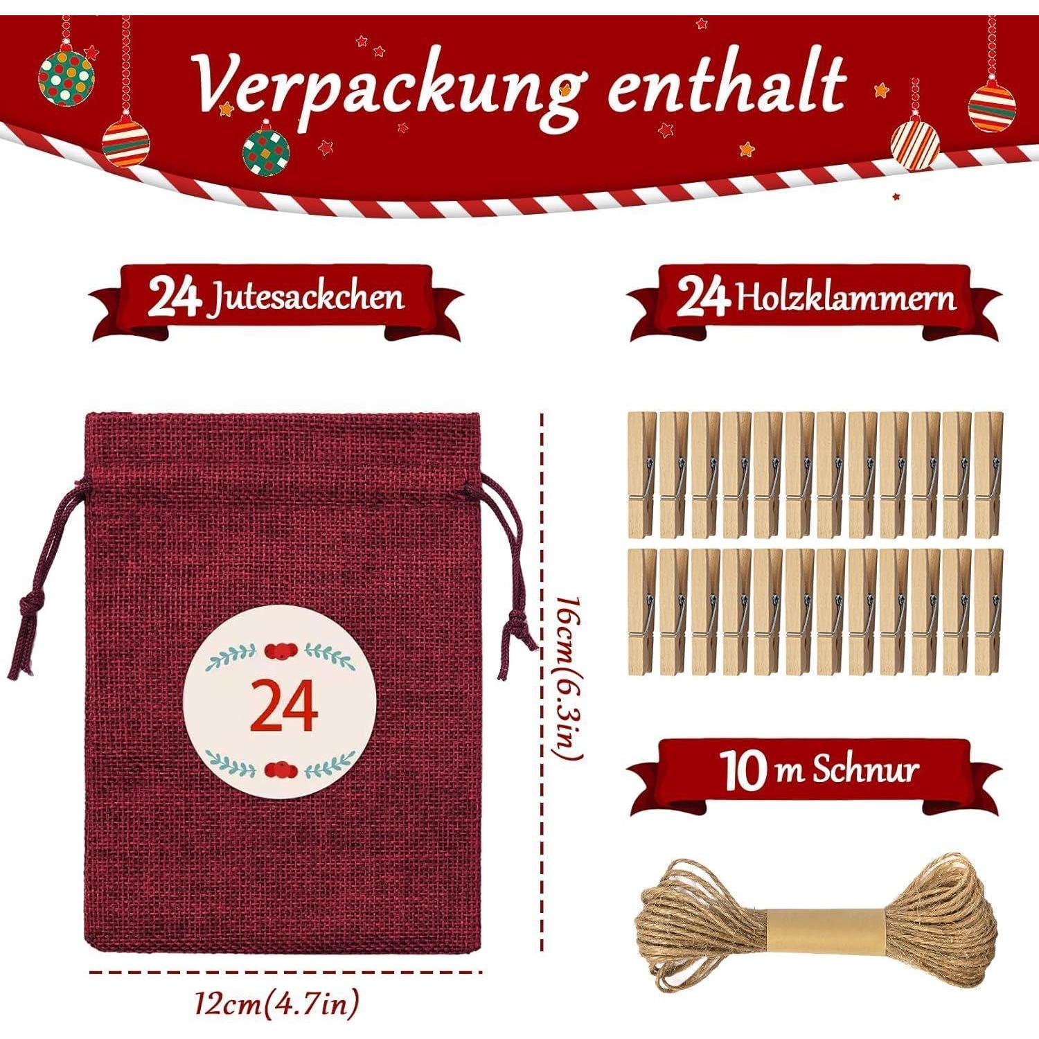 Das Set enthält insgesamt 24 große Jutesäckchen, 24 Weihnachtsaufkleber (einschließlich 3 undatierten Aufklebern), 24 Holzklammern und 10 Meter Hanfseil. So haben Sie alles, was Sie brauchen, um einen einzigartigen Adventskalender zu erstellen und die Vorfreude auf Weihnachten zu steigern.