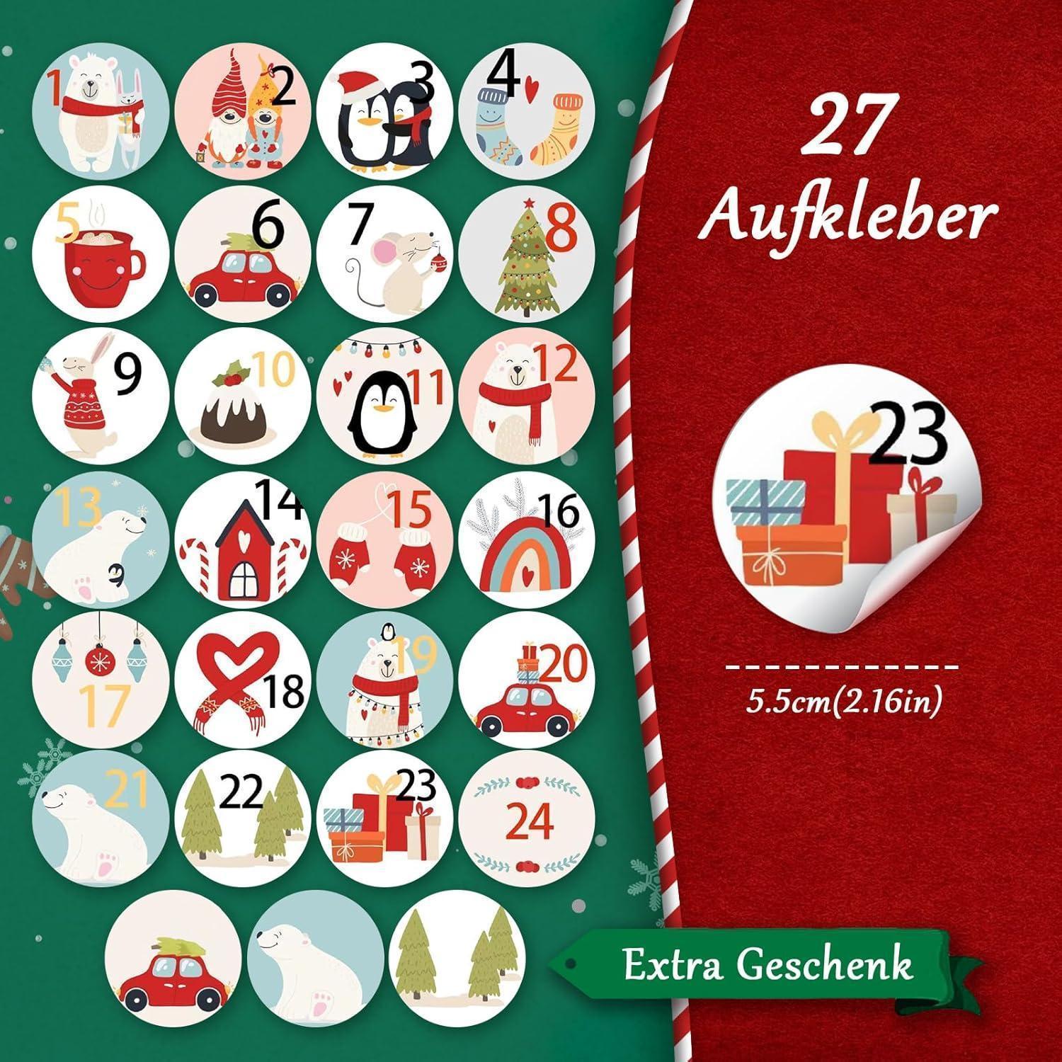 Reichhaltiges Set - Enthält Adventskalender, Weihnachtsaufkleber, Klammern und Hanfseil