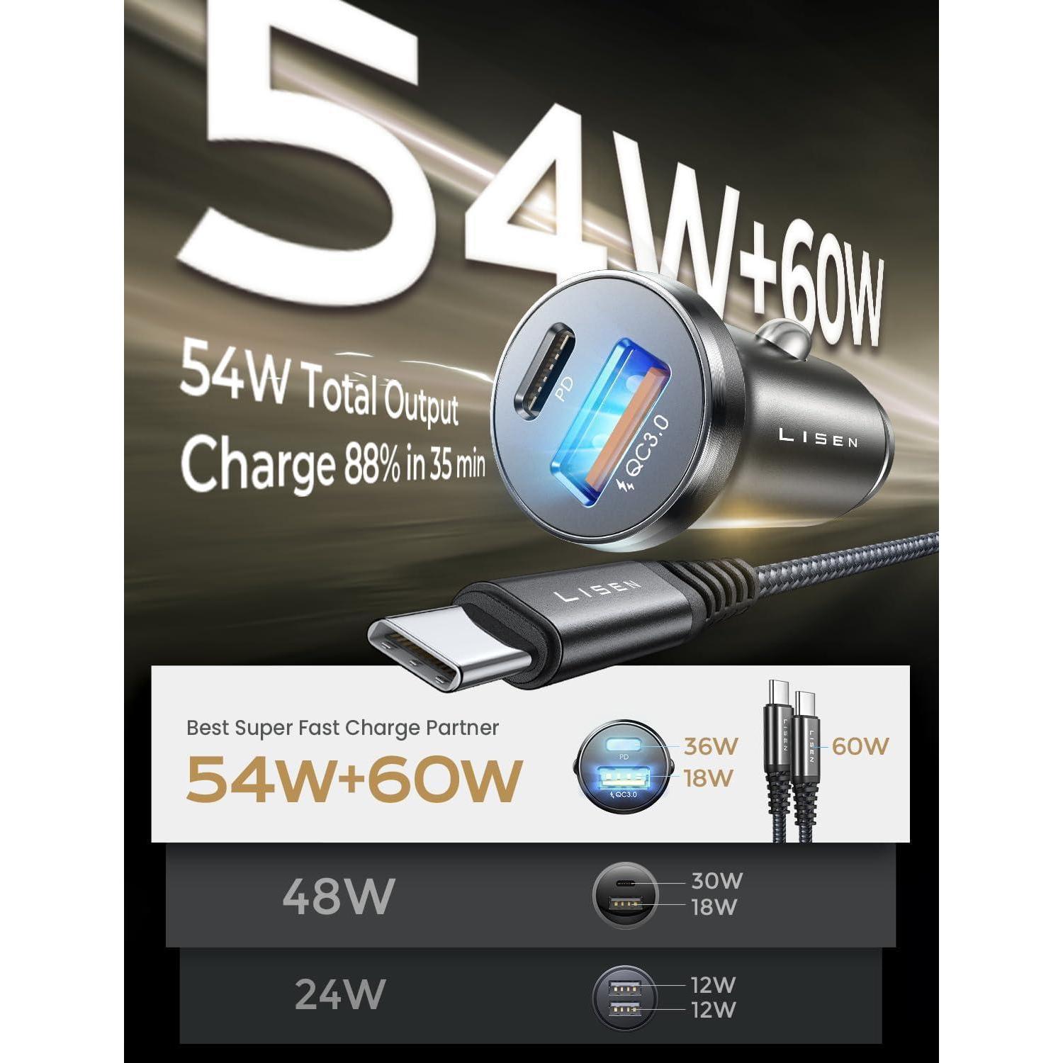 LISEN 54W Zigarettenanzünder USB Ladegerät: Superschnelles Aufladen mit Dual-Ports PD 3.0 & QC 3.0