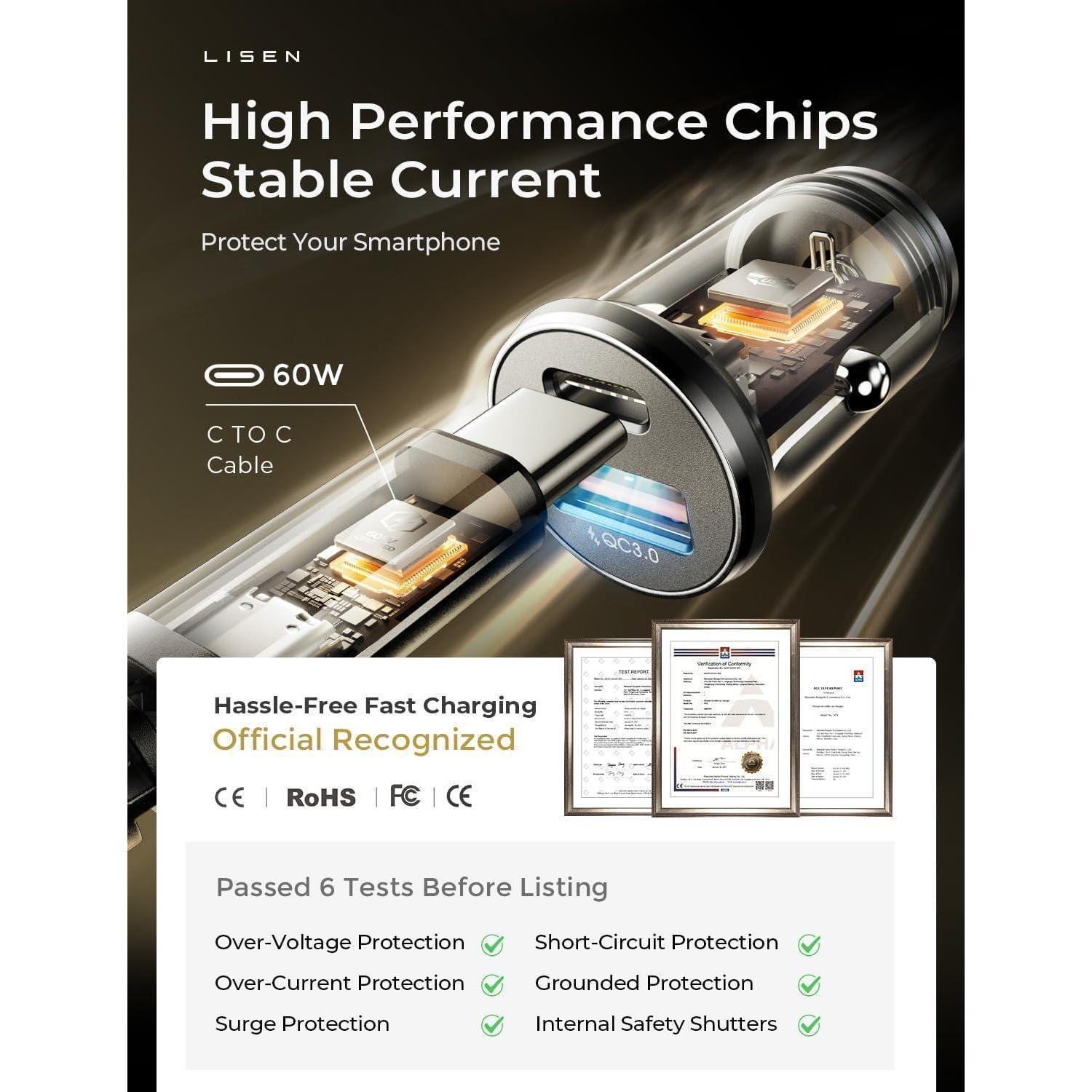 Das LISEN 54W Zigarettenanzünder USB C PD&QC3.0 Auto Ladegerät ist das ideale Zubehör für Ihr Fahrzeug. Mit einem 60W USB C Kabel für schnelles Aufladen, einer vollständig aus Aluminium gefertigten Konstruktion für niedrige Temperaturen und Sicherheit sowie kompakten Abmessungen für einen bündigen Sitz, bietet dieses Ladegerät sowohl Leistung als auch Stil. Der Dual-Port-Anschluss ermöglicht superschnelles Aufladen, während der 24/7 After Sales Service Ihnen Sicherheit bietet.