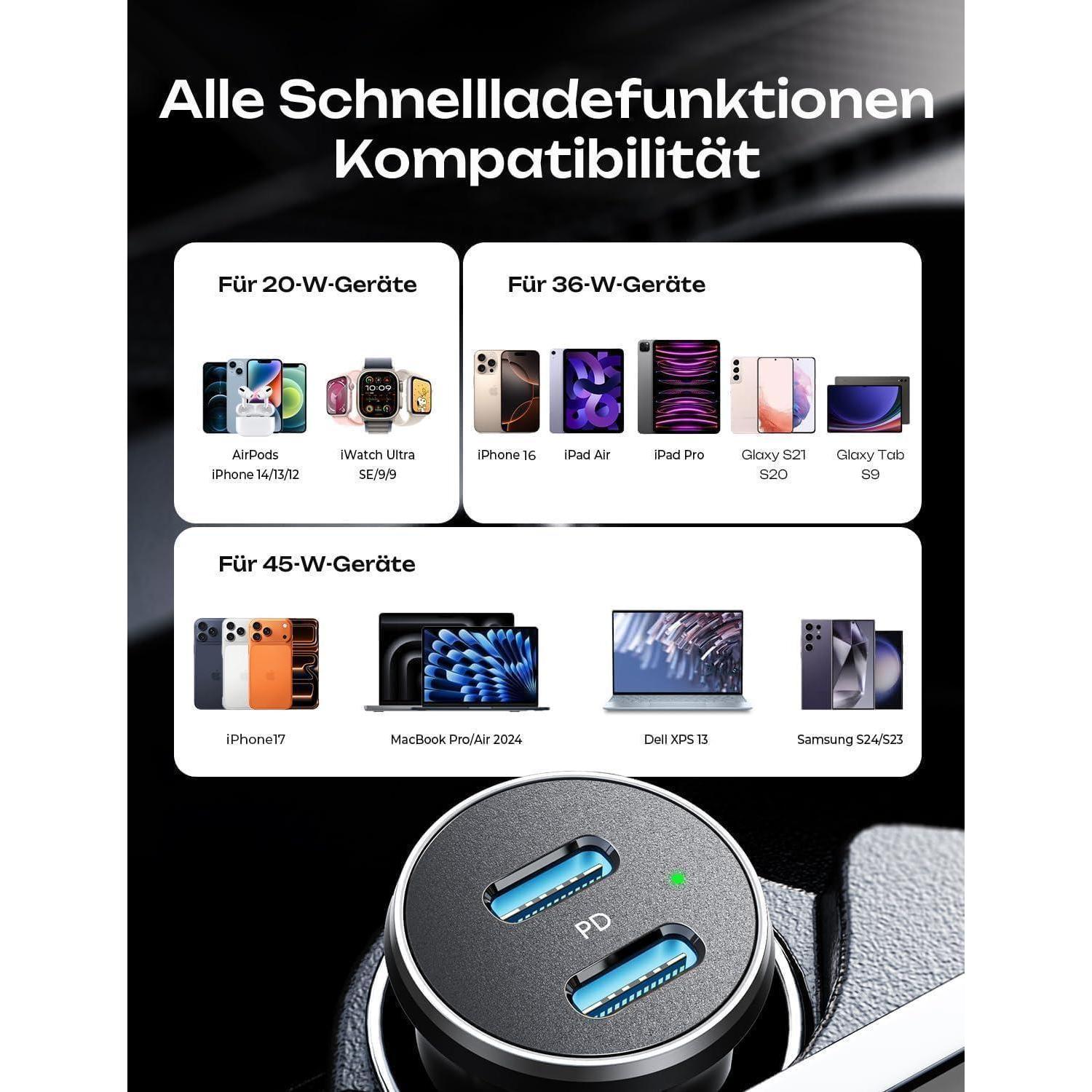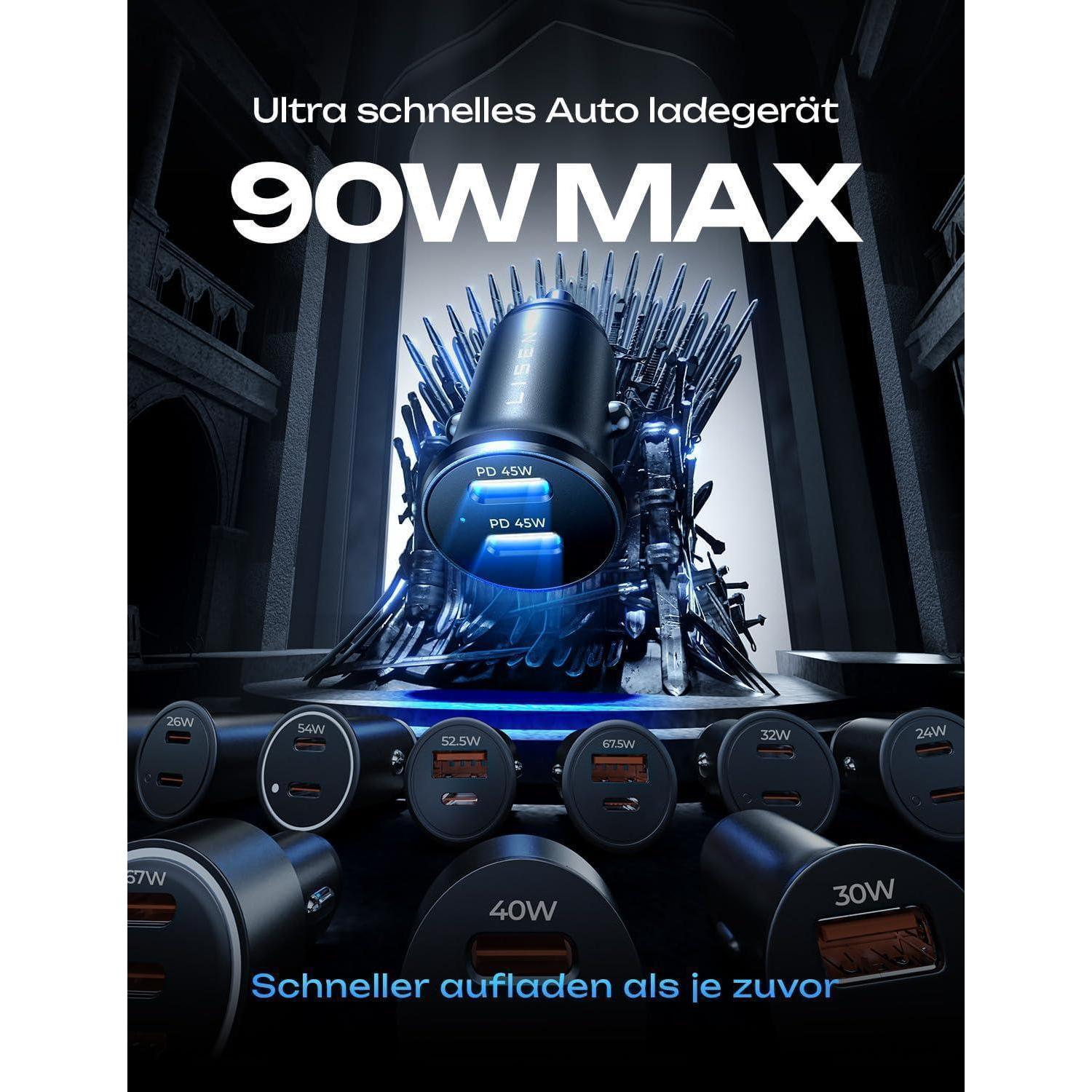 LISEN 90W Auto Ladegerät USB C Verteiler PD45W Schwarz