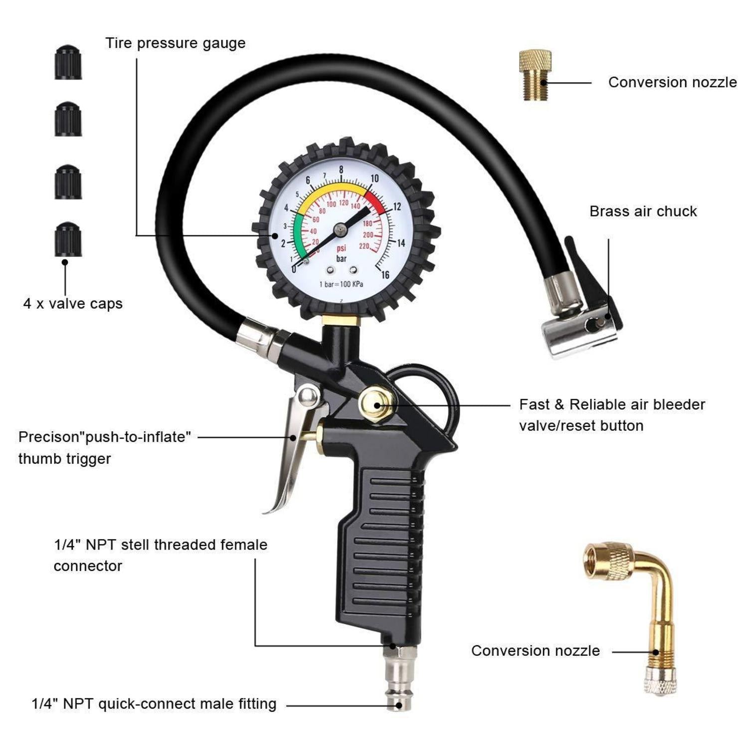 Luftdruckprüfer Reifenfüller 220 PSI Multifunktion Schwarz