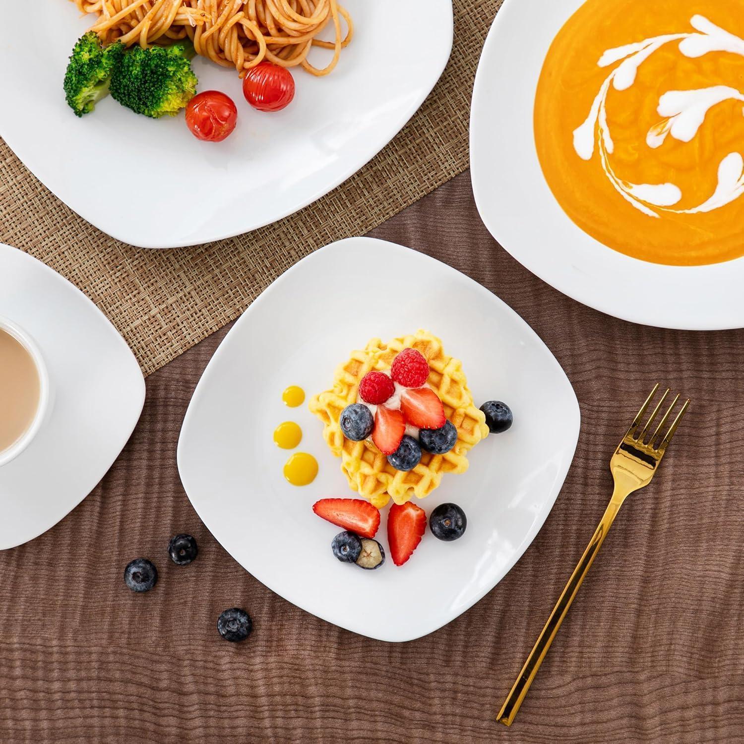 Genießen Sie jedes Mahlzeit mit diesem hochwertigen Porzellan Tafelservice, das durch traditionelle Handwerkskunst hergestellt wurde. Jeder Teller ist dünn und leicht, aber dennoch robust und langlebig. Die Speiseteller haben eine Größe von 9,7 Zoll, die Dessertteller von 7,4 Zoll und die Suppenteller von 8,4 Zoll.