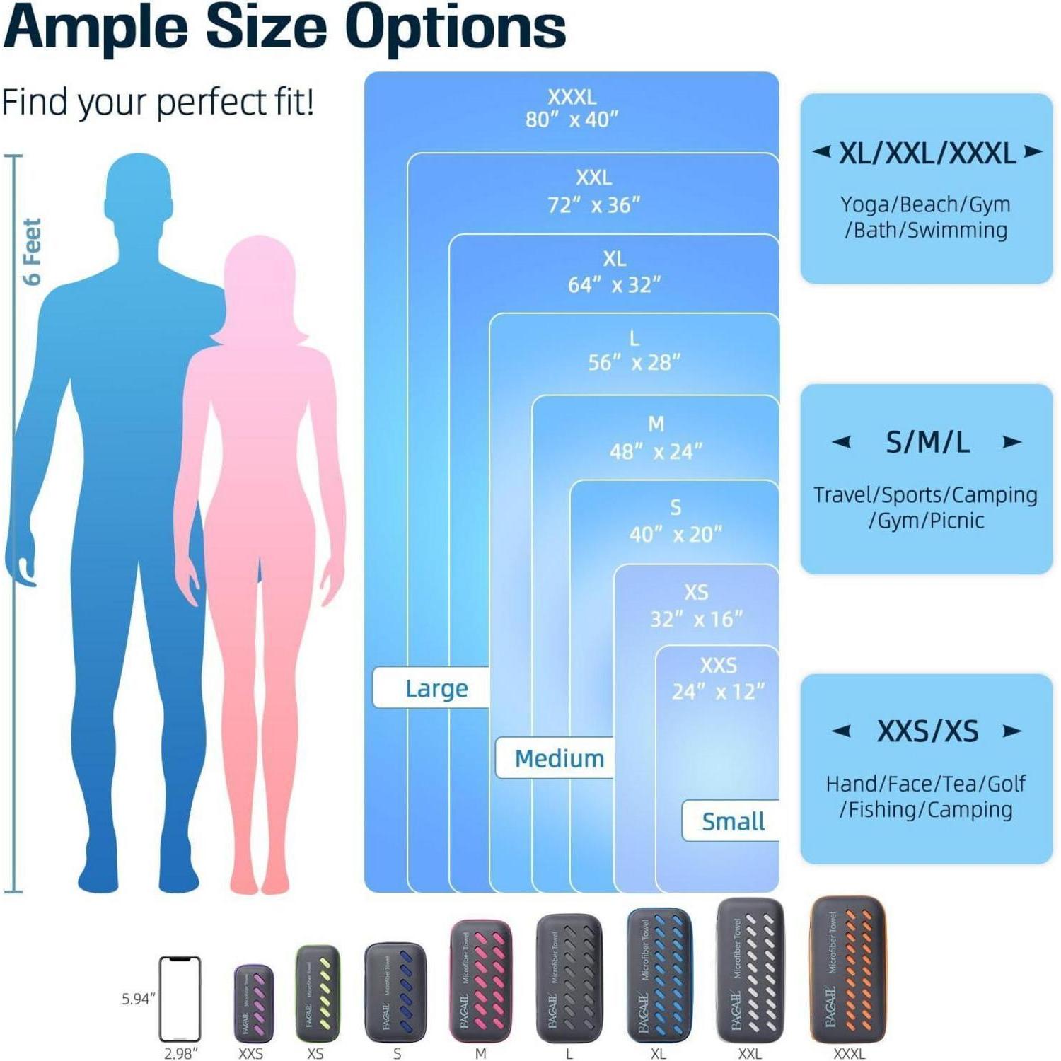 Mehrere Größen - Wählen Sie Handtücher in verschiedenen Größen für Sport, Strand, Rucksackreisen oder Camping. Wir bieten viele Größenoptionen (von 30 x 60 cm für Sport bis 100 x 200 cm für Strand oder Yoga), die für alles geeignet sind, was Sie brauchen. Alle Handtücher werden in einem EVA-Etui mit Reißverschluss geliefert, das äußerst bequem zu tragen ist.