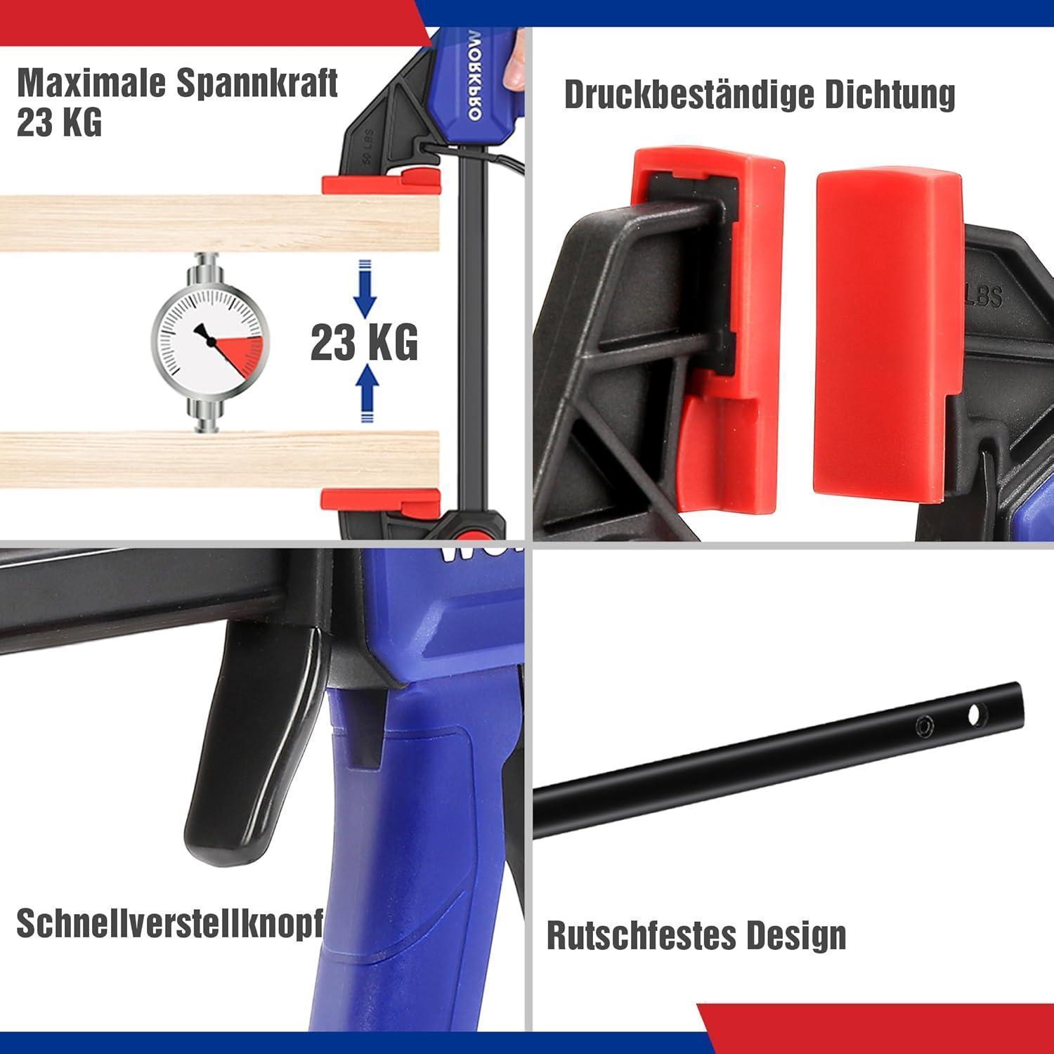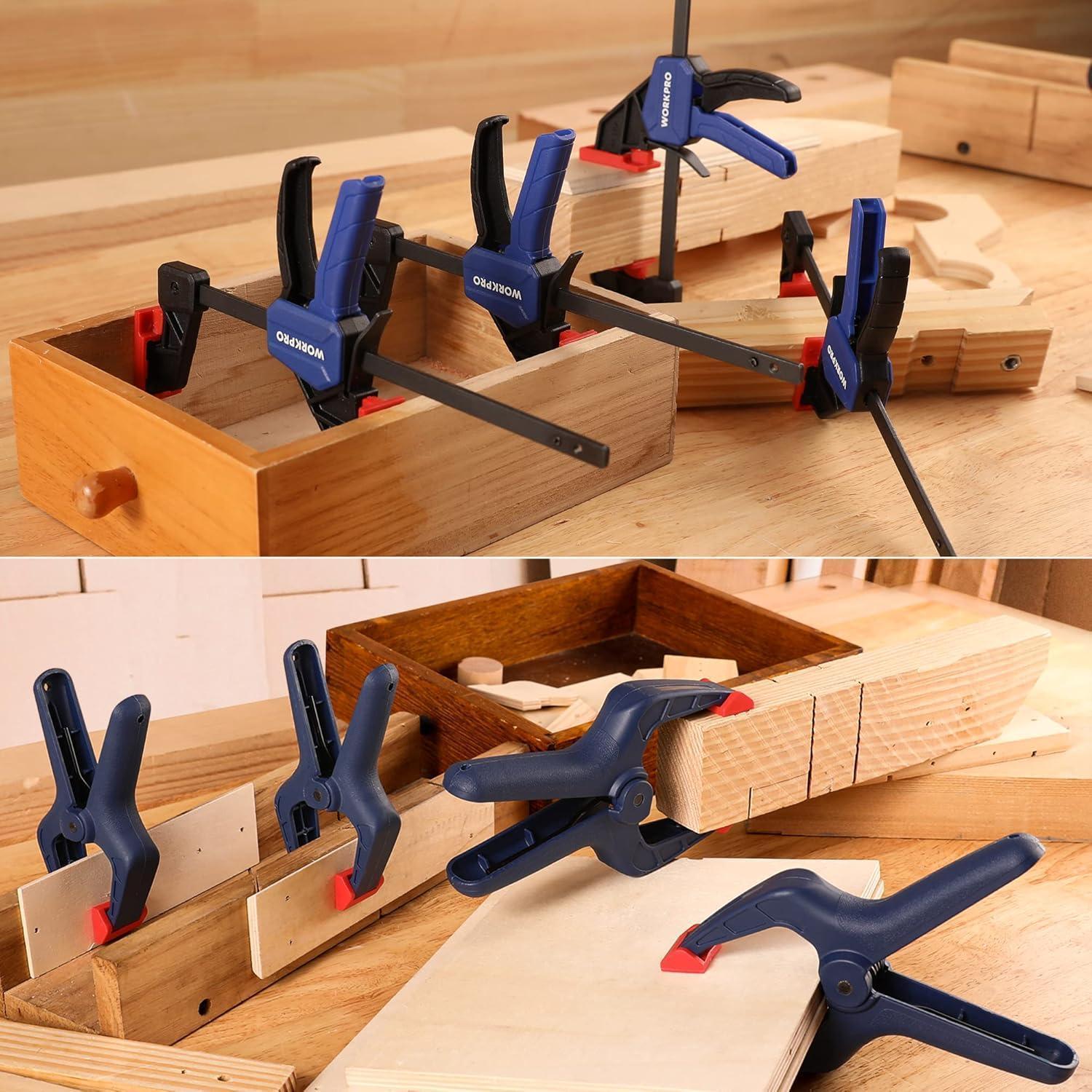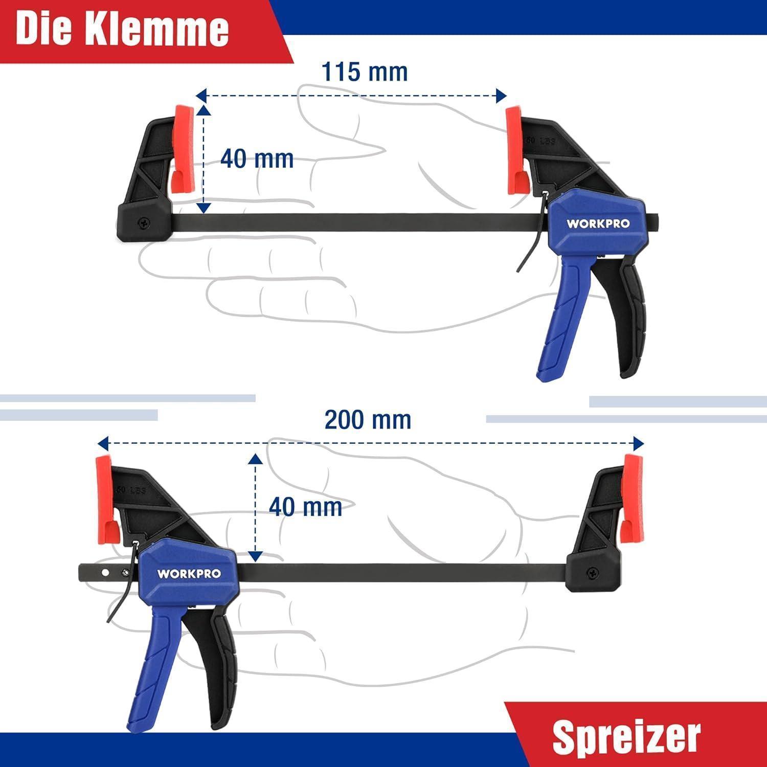 Lieferumfang: WORKPRO Holzbearbeitung Set enthält 4 Mini Einhandzwingen (Maultiefe von 40mm, Spannweite von bis zu 115mm, Spannkraft von bis zu 23kg, Dehnbereich von bis zu 200mm), 2 Federklemmen 115mm (Maulweite von 45mm) und 2 Federklemmen 165mm (Maulweite von 60mm).