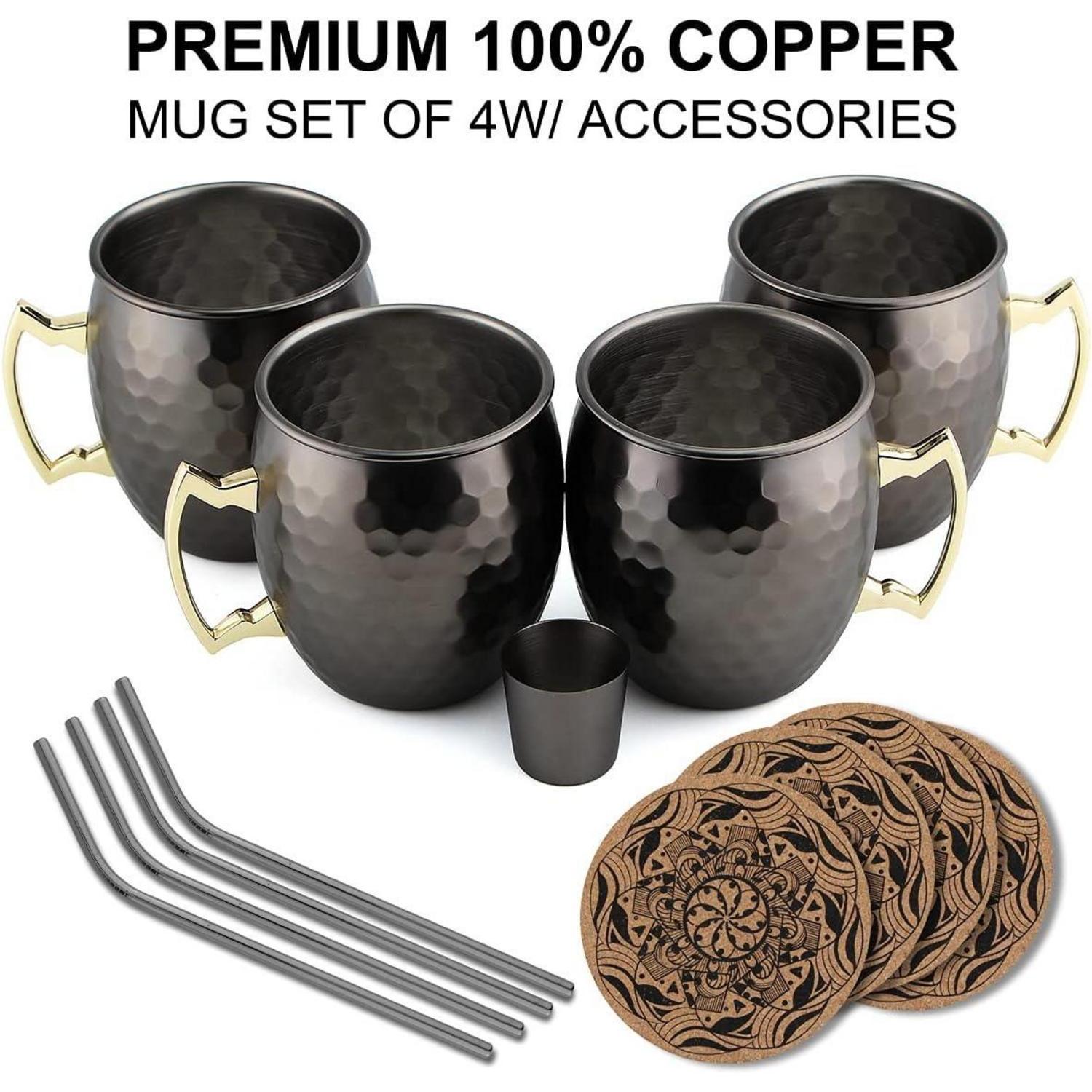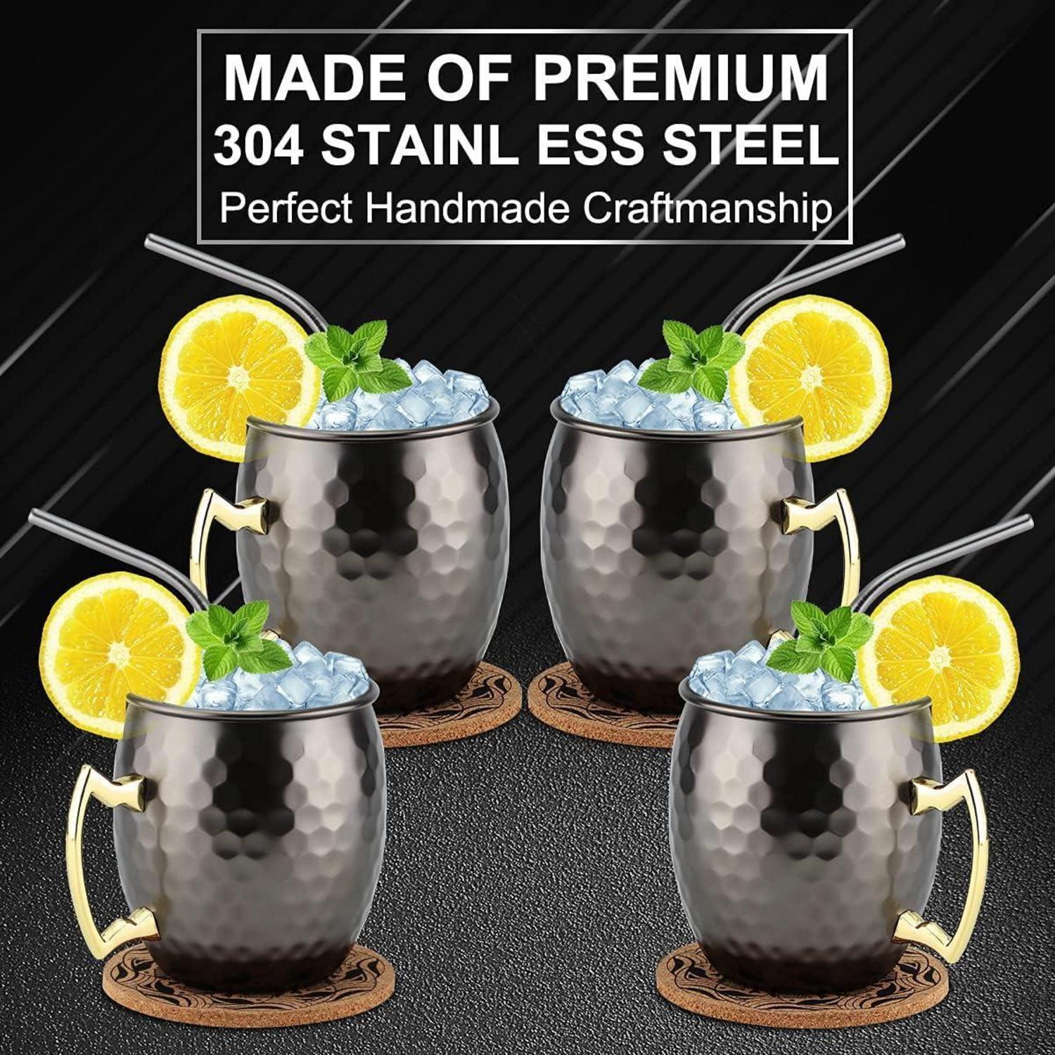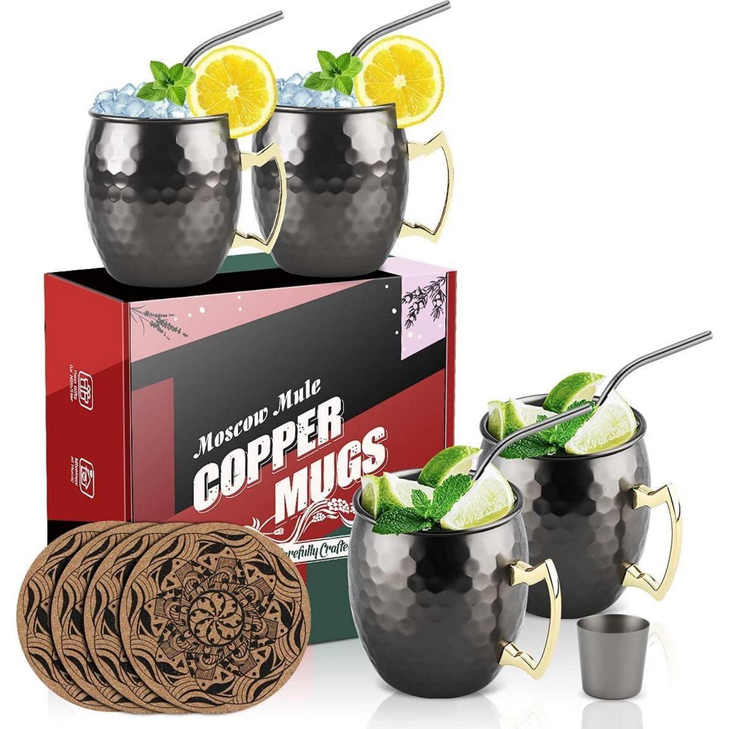 Moscow Mule Becher Kupferbecher Schwarz Gehämmert und Handgefertigt Kupfertassen mit 4 Gläsern, 4 Untersetzer, 4 Trinkhalme, 1 Messbecher