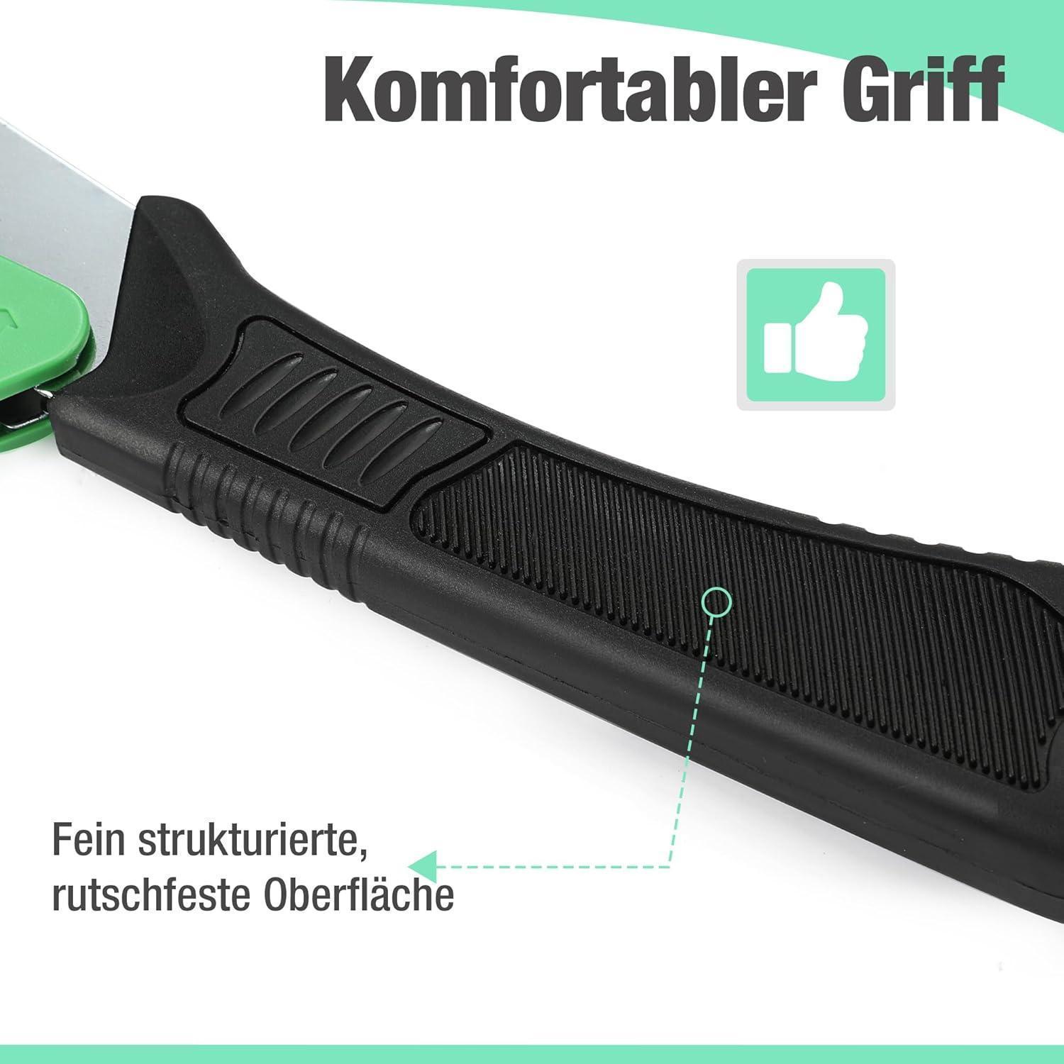 Die Astsäge verfügt über ein sicheres Verriegelungssystem, das Unfälle verhindert. Der rutschfeste ergonomische TPR-Gummigriff reduziert die Handermüdung und ermöglicht komfortables Arbeiten. Dank der einstellbaren Position des Sägeblattes können Sie den Winkel an Ihre Bedürfnisse anpassen. Die beigefügte Gürteltasche erleichtert die Aufbewahrung und den Transport der Säge.