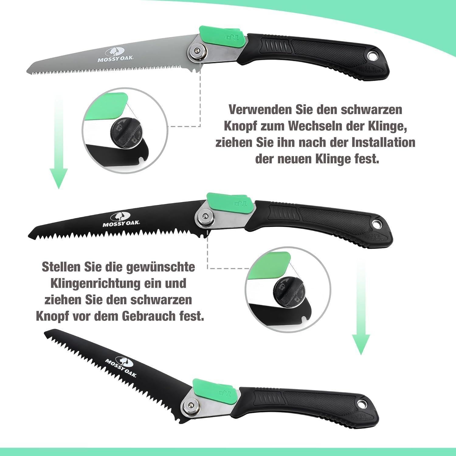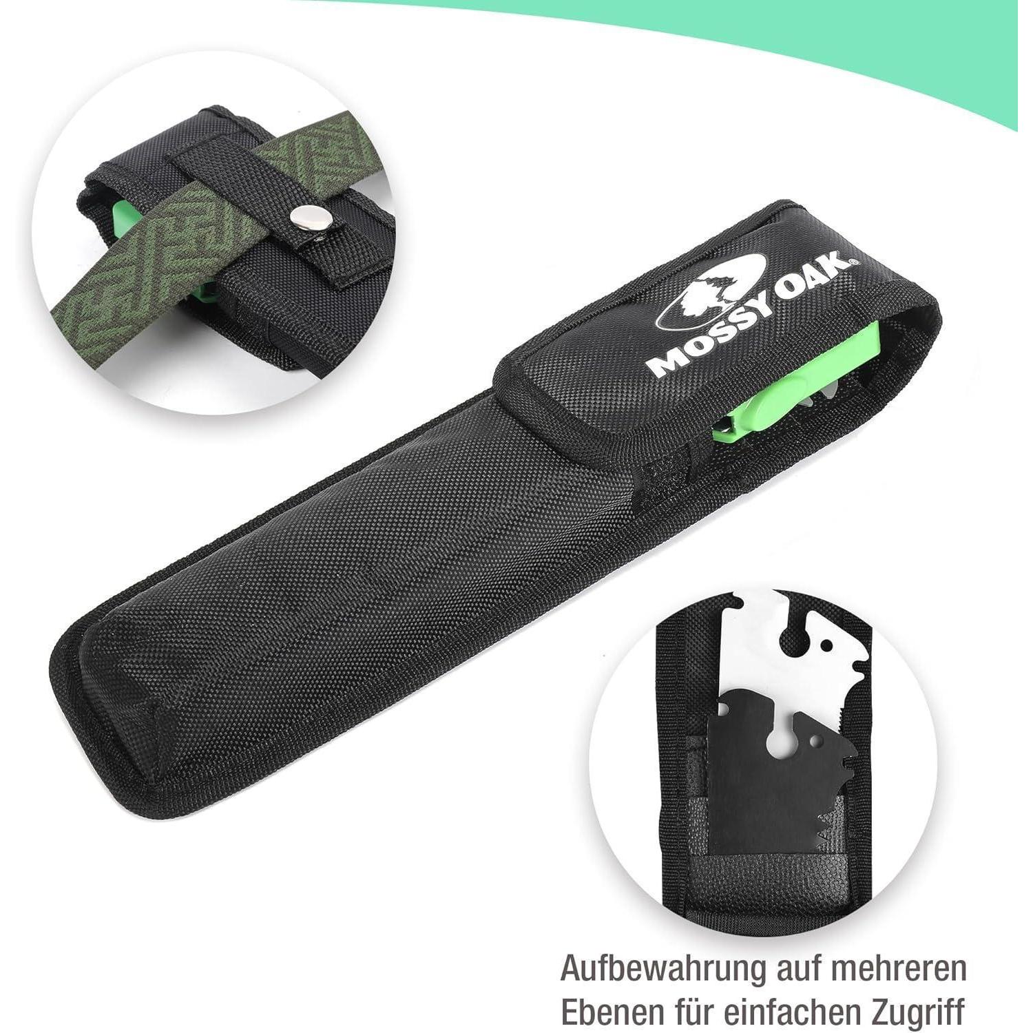 Hergestellt aus hochwertigem CrV-Stahl, bietet die Mossy Oak Klappsäge Langlebigkeit, Härte, Verschleißfestigkeit und Rostbeständigkeit. Die scharfen Zähne ermöglichen präzise und effiziente Schnitte, die schneller und schärfer sind als bei herkömmlichen Sägen. Ob beim Entfernen von Ästen, in Ihrem Garten, beim Camping oder anderen Outdoor-Aktivitäten - diese Astsäge ist ein unverzichtbares Werkzeug.