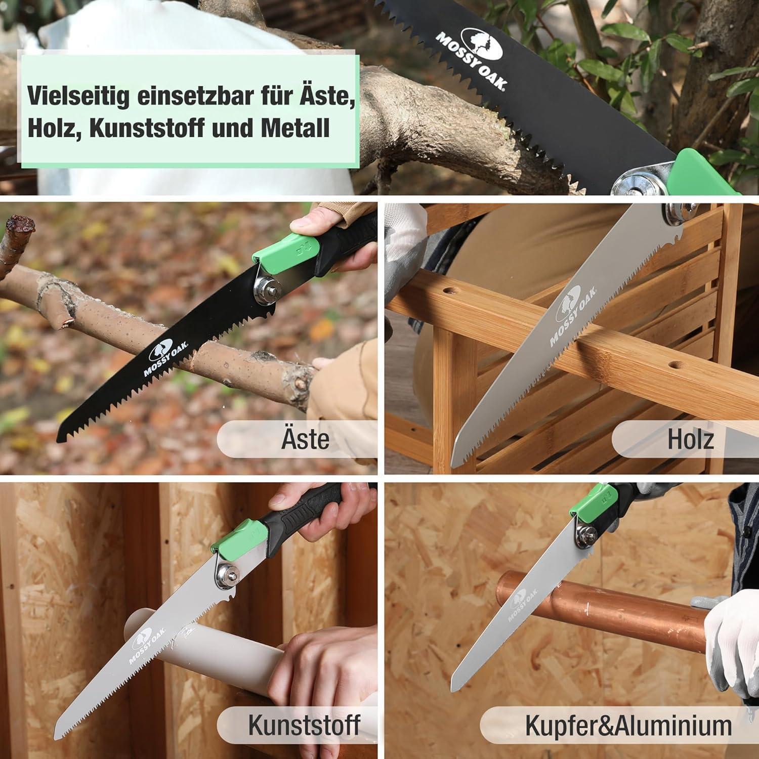 Die Mossy Oak 3 in 1 Handsäge Astsäge ist ein vielseitiges Werkzeug für Ihre Outdoor-Bedürfnisse. Diese Klappsäge wird mit 3 Klingen geliefert: eine für Holz, eine für Plastik und eine für Metall, sowie eine praktische Nylontasche zur Aufbewahrung. Mit ihrem 3-in-1 Design ermöglicht sie schnelle, präzise und saubere Schnitte in verschiedenen Materialien wie Holz, Kunststoff, Gummi, Glas, Bambus, Seil, Weichmetall, Fliesen, Keramik, Stein und PVC.