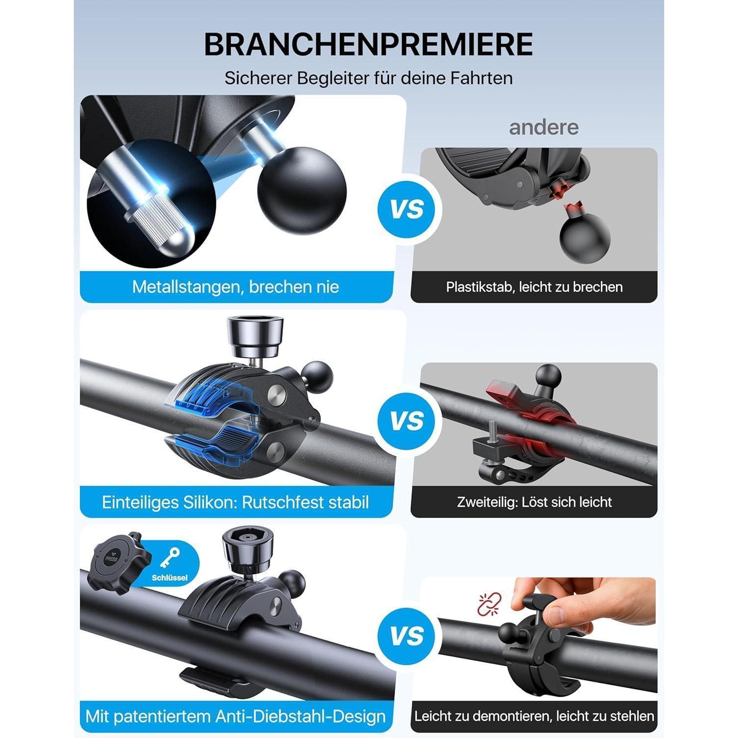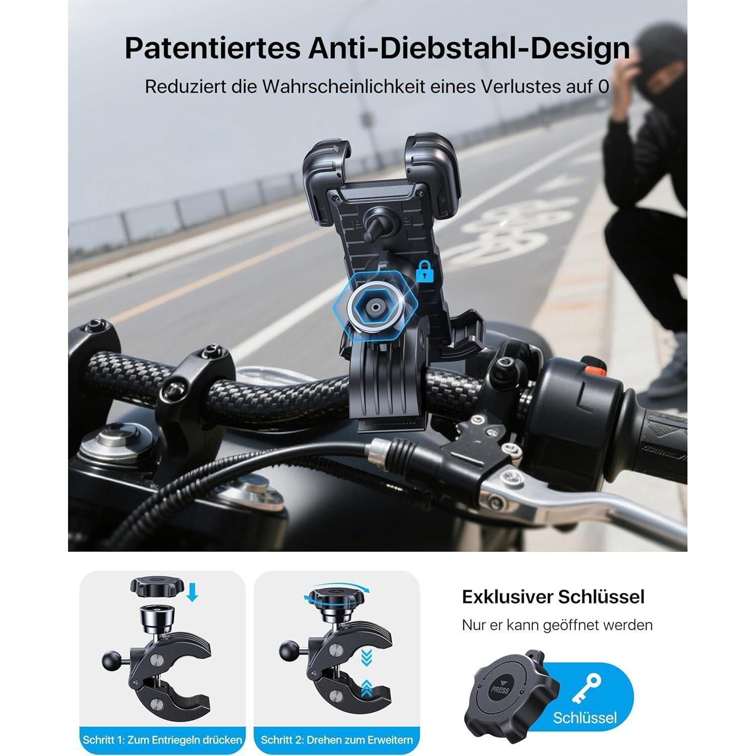 【Verbesserter Clipkopf mit Diebstahlschutz】 Die verbesserte Handyhalterung Fahrrad besitzt einen stabilen Clipkopf mit Diebstahlschutzfunktion. Die Diebstahlsicherung erschwert Diebstahlversuche. Bei Schlüsselverlust wird lebenslanger Ersatz geboten.