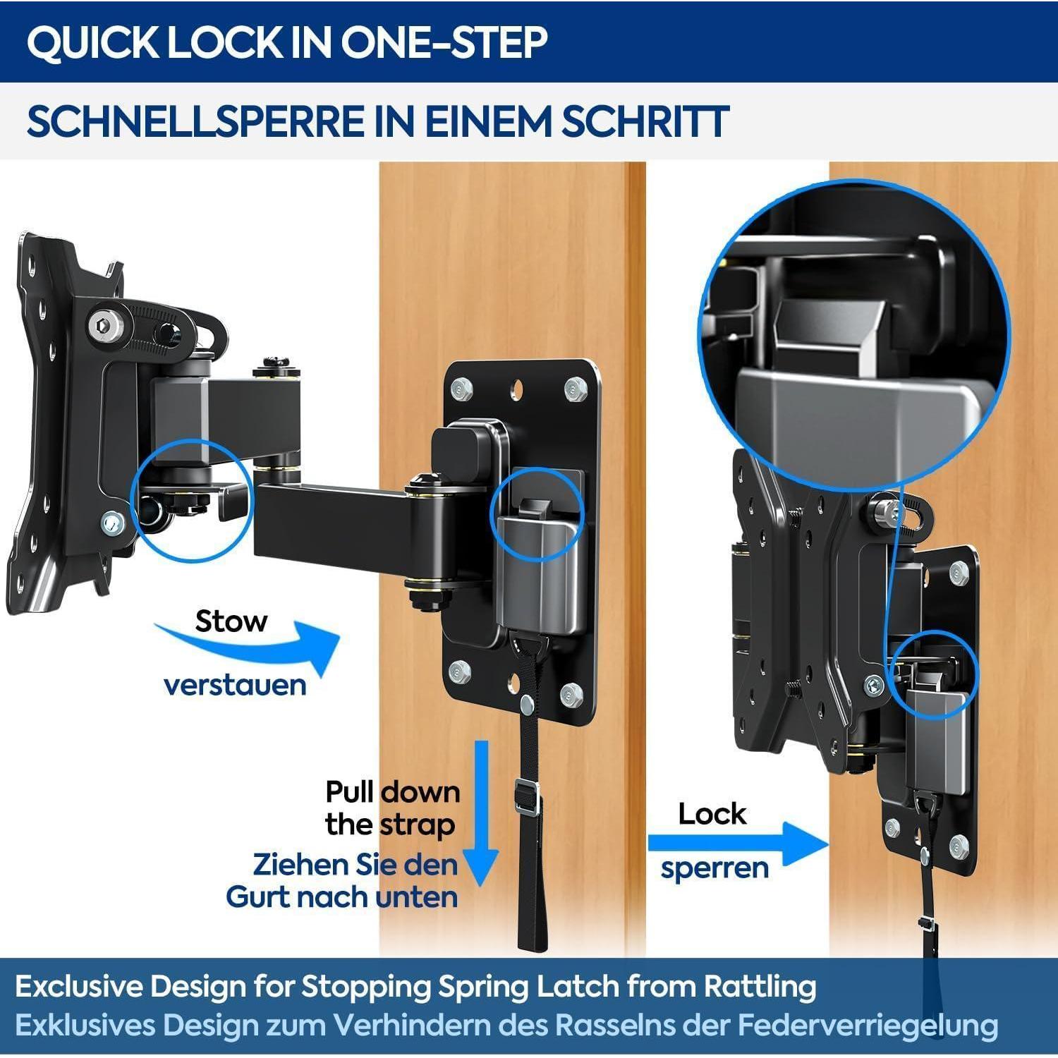 Die Installation dieser TV-Halterung könnte nicht einfacher sein. Mit qualitativ hochwertigem Zubehör und einer klaren mehrsprachigen Anleitung (EN / DE / FR / ES / IT) ist die Montage ein Kinderspiel. Zudem ermöglicht das einzigartige Verriegelungsdesign ein sicheres Arretieren Ihres Fernsehers für unterwegs.