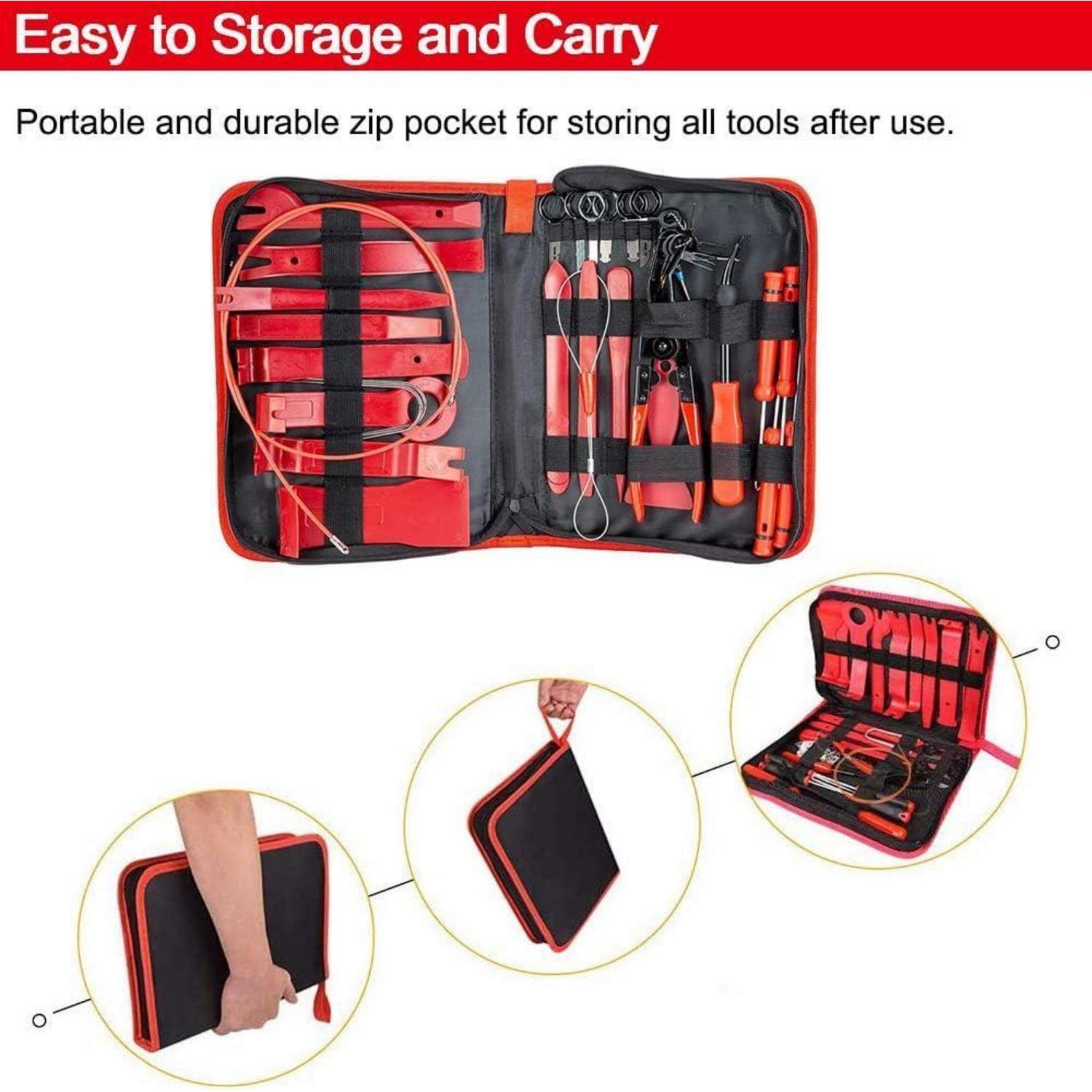 Die Aufbewahrungstasche mit Reißverschluss ermöglicht eine ordentliche Aufbewahrung aller Werkzeuge, ohne dass etwas verloren geht. So haben Sie jederzeit alles griffbereit und können Ihre Montage- und Demontageaufgaben mühelos erledigen. Ob für den Innen- oder Außenbereich, dieses Set bietet Ihnen alles, was Sie brauchen, um Ihre Autoteile professionell zu bearbeiten.