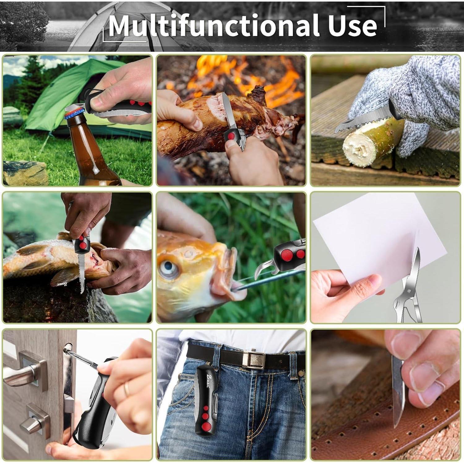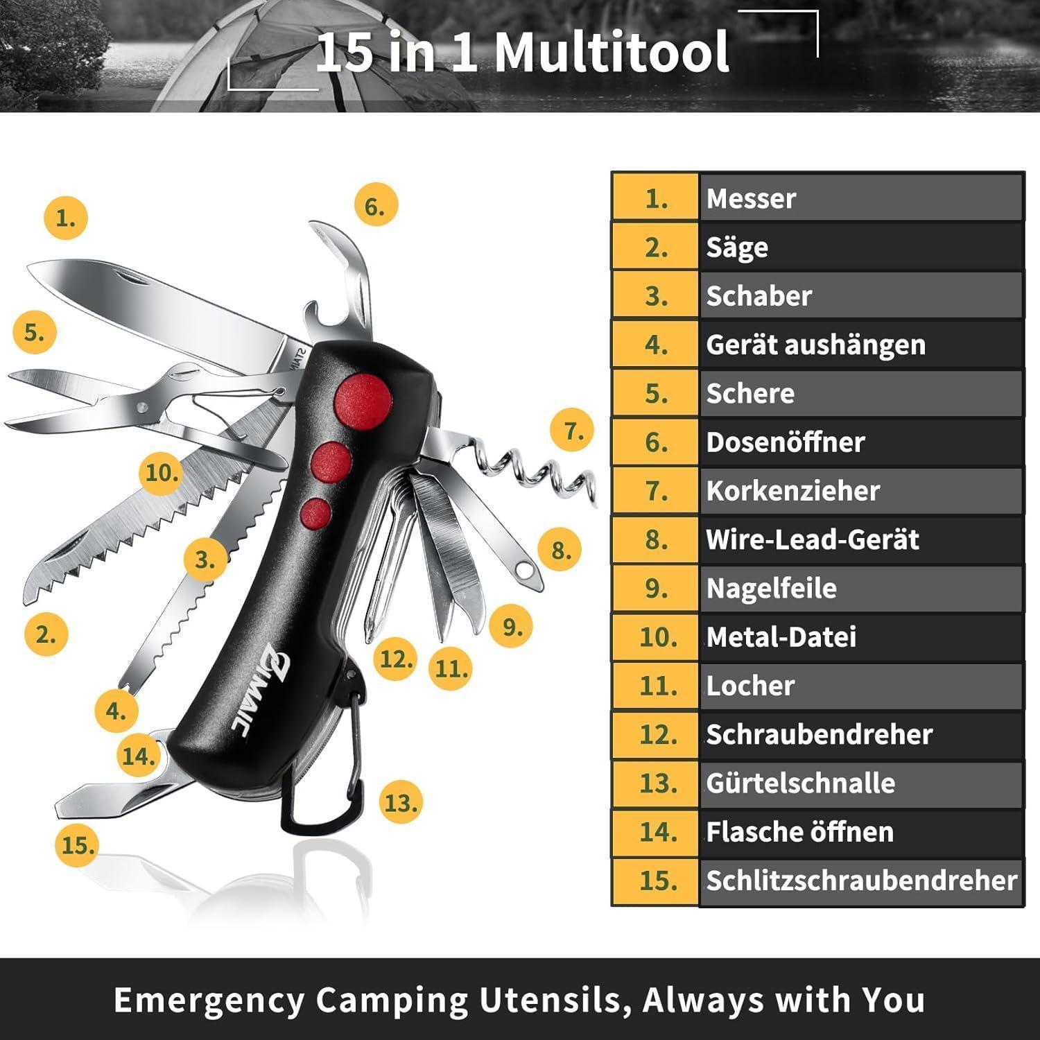 Das ZIMAIC Taschenmesser ist ein Multitool, das speziell für vielseitige Einsätze entwickelt wurde. Mit 15 Funktionen ist dieses Schweizer Taschenmesser ein unverzichtbarer Begleiter für Outdoor-Aktivitäten, Notfälle und den täglichen Gebrauch. Zu den Funktionen gehören ein Schlitzschraubendreher, Dosenöffner, Korkenzieher, Fischschupper, Hakenentferner, Schlüsselring, Messer, Leder Punch, Nagelreiniger, Metallfeile, Nadel, Kreuzschlitzschraubendreher, Säge und Schere.