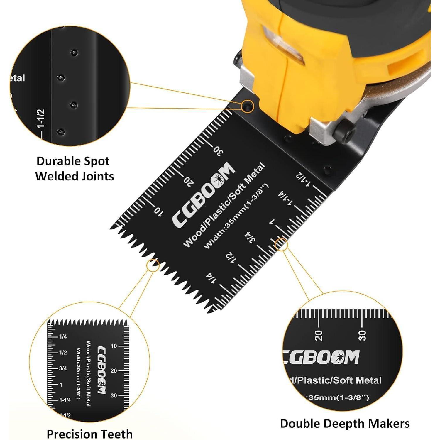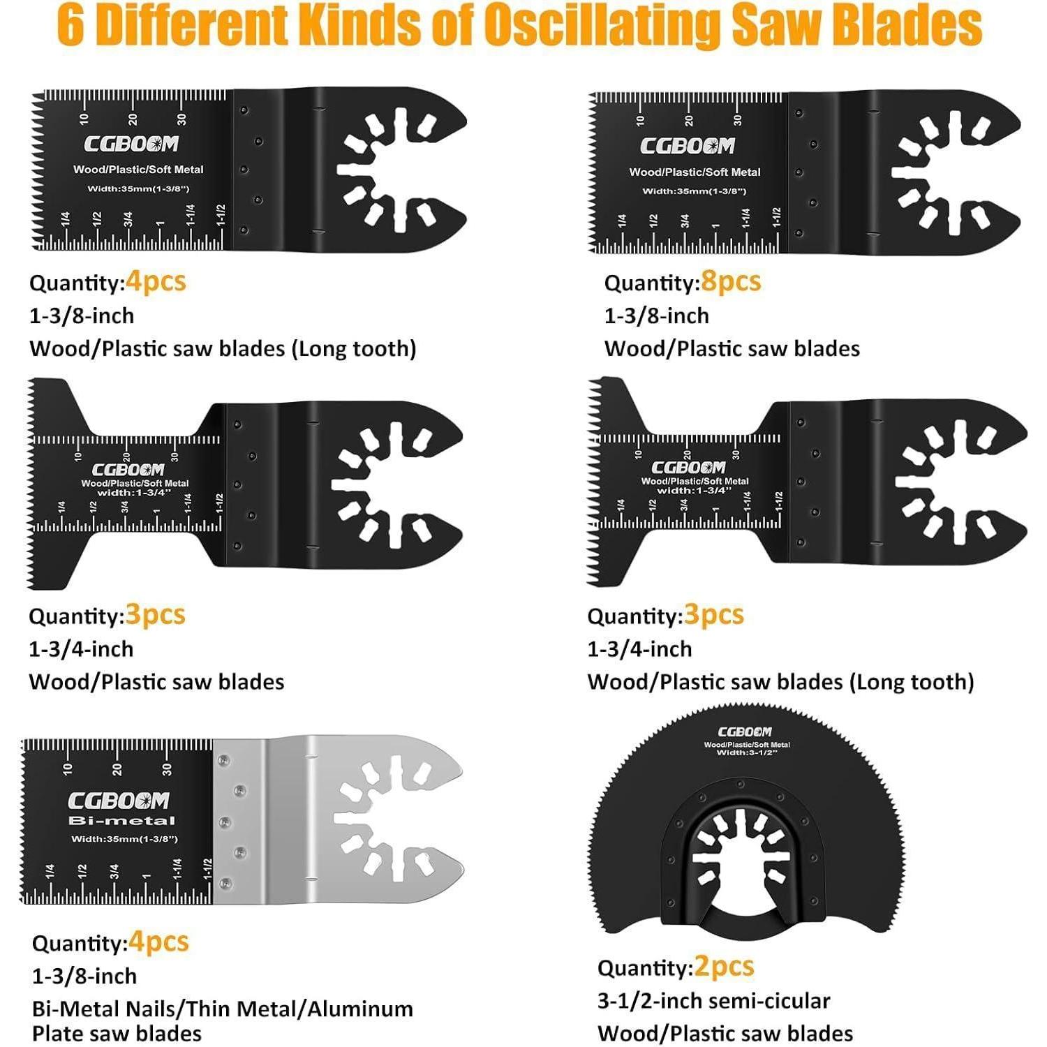 Erstaunliche Schneiderfahrung: Alle oszillierenden Sägeblätter in diesem Set bieten eine äußerst hilfreiche Tiefenmessung und sind ideal für das präzise Schneiden von Holz, Kunststoff, Spanplatten, Laminat, Parkett und weichem Metall. Tauchen Sie ein in die Welt des erstaunlichen Sägeblattschneidens mit dem CGBOOM 26-teiligen Set.