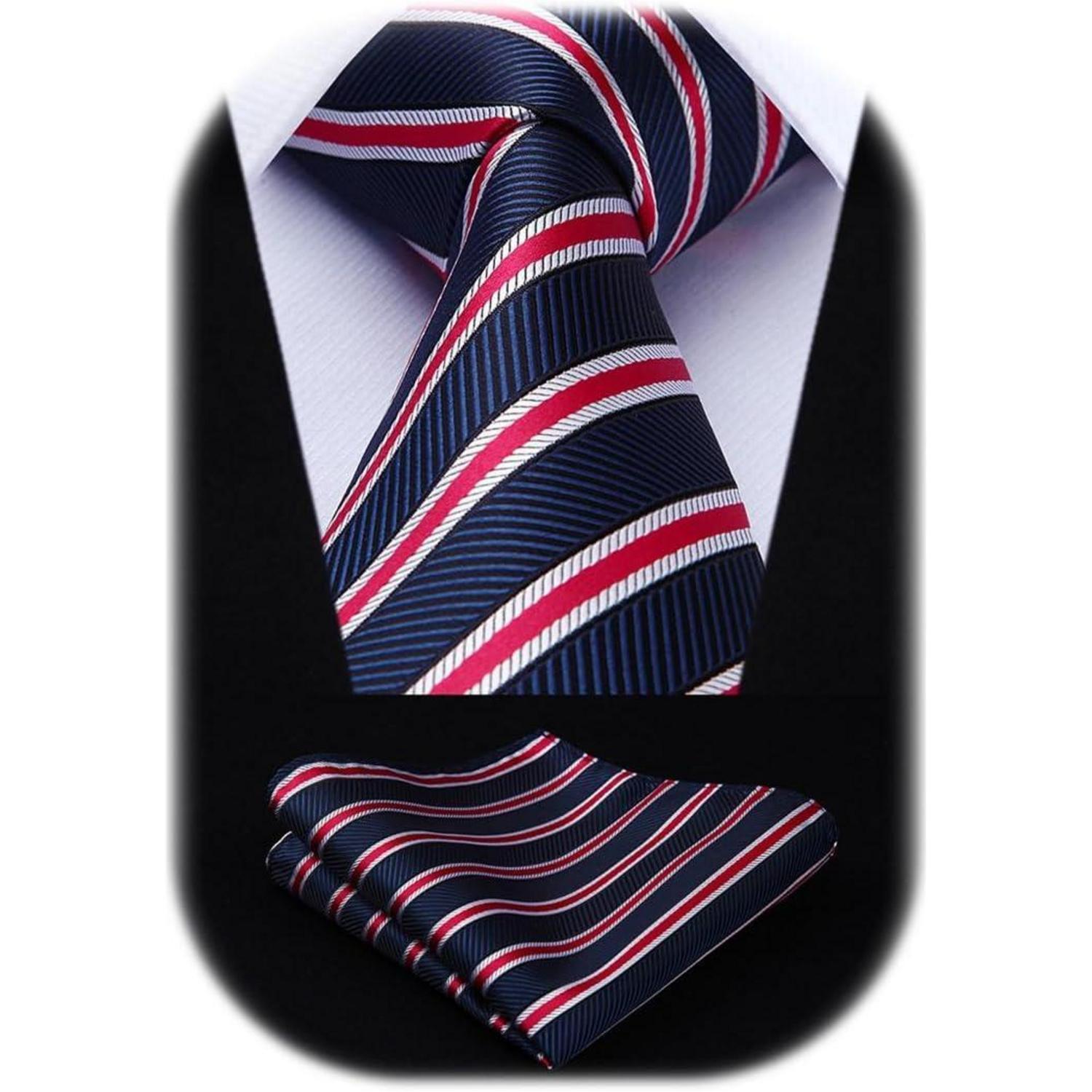 Navy Blue Red Striped Extra Long Tie Pocket Square Set