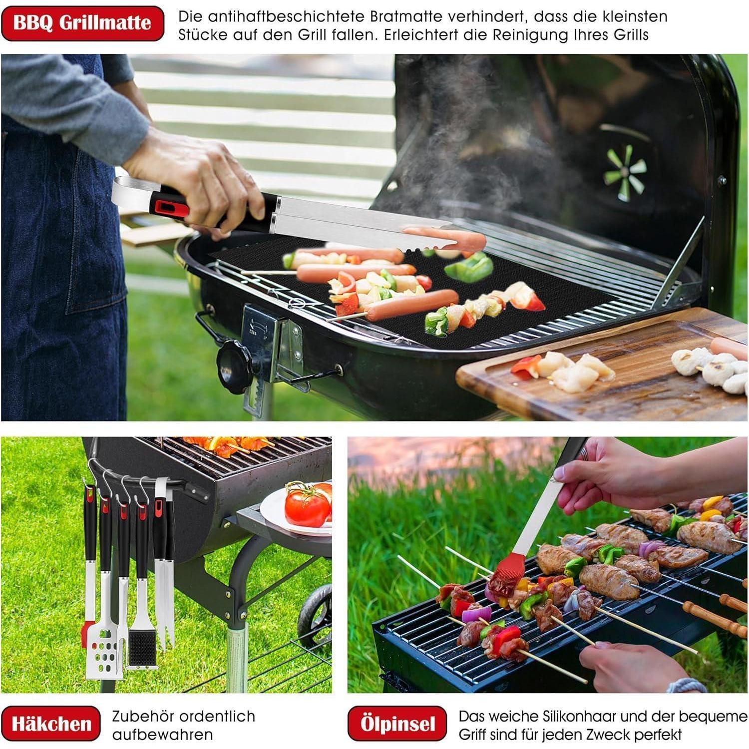 Das Set beinhaltet einen Grillspatel, eine Grillzange, eine Grillgabel, eine Grillbürste, einen Ölpinsel, eine Tragetasche, 2 Grillmatten und 5 Haken zum Aufhängen. Der 3-in-1 Spatel bietet nicht nur eine breite Fläche zum Wenden von Speisen, sondern verfügt auch über einen integrierten Flaschenöffner für das gemütliche Bier am Grillabend. Die scharfe Grillgabel durchsticht mühelos Fleischstücke und die Grillbürste hilft Ihnen, Ihren Grill leicht zu reinigen.