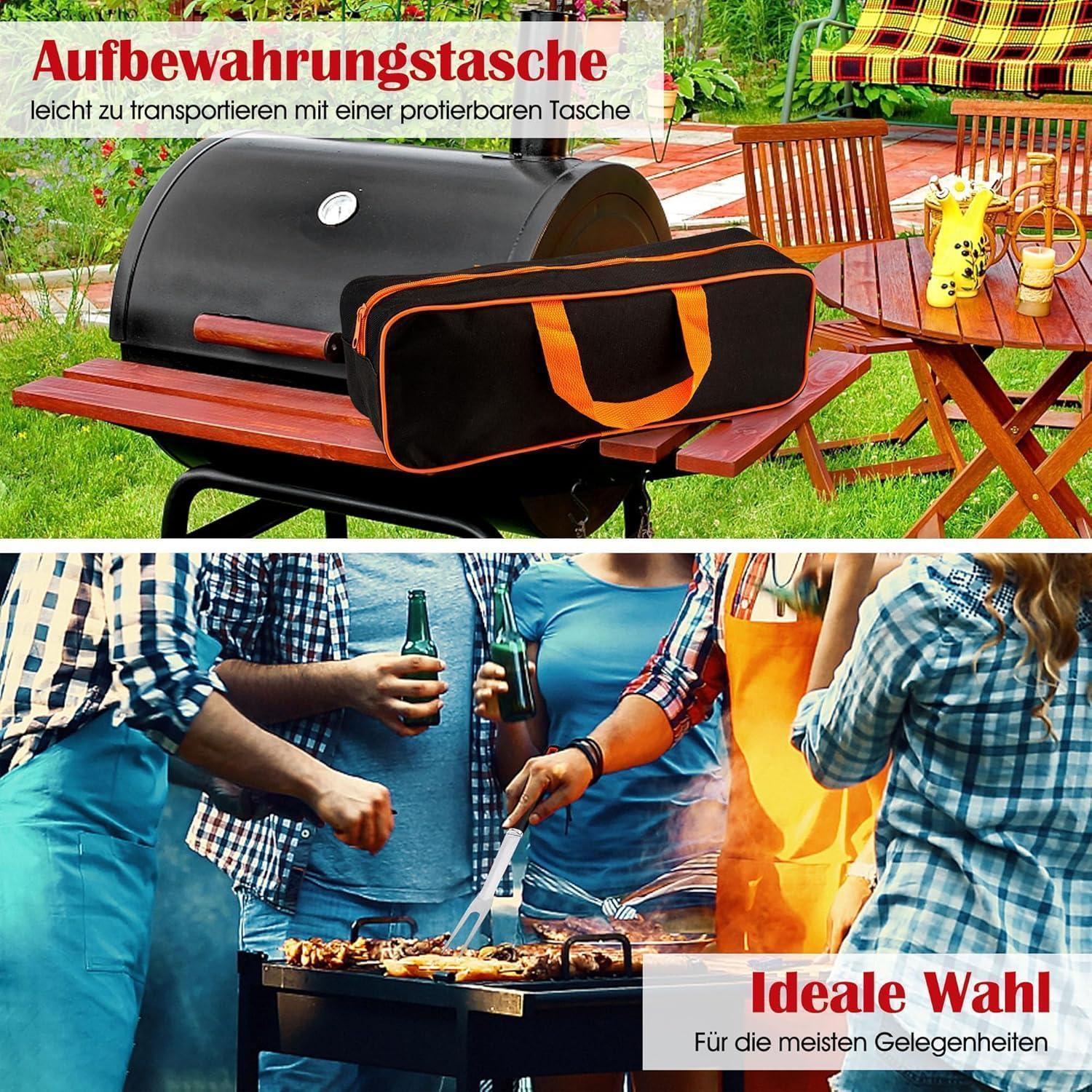 Mit der praktischen Tragetasche können Sie Ihr Grillbesteck ordentlich verstauen und transportieren. Die glatte Oberfläche der Werkzeuge macht sie leicht zu reinigen und sie sind sogar spülmaschinenfest. Die Möglichkeit, das Besteck an den 5 mitgelieferten Haken aufzuhängen, spart Platz und hält Ihre Werkzeuge griffbereit.
