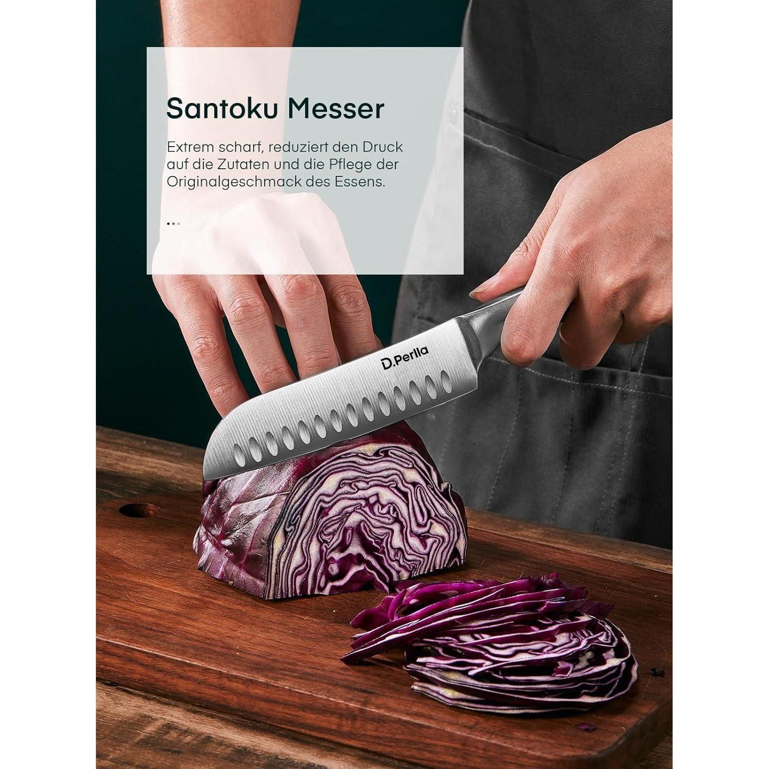 Das D.Perlla Messerblock Set ist die perfekte Wahl für Einsteiger und Hobbyköche. Mit einem 16-teiligen Profi Messer Set, das verschiedene Messertypen wie Kochmesser, Fleischmesser, Brotmesser, Santoku Messer, Steakmesser, Gemüsemesser, Schälmesser, Wetzstahl und Küchenschere enthält, sind Sie für jede kulinarische Herausforderung gerüstet.