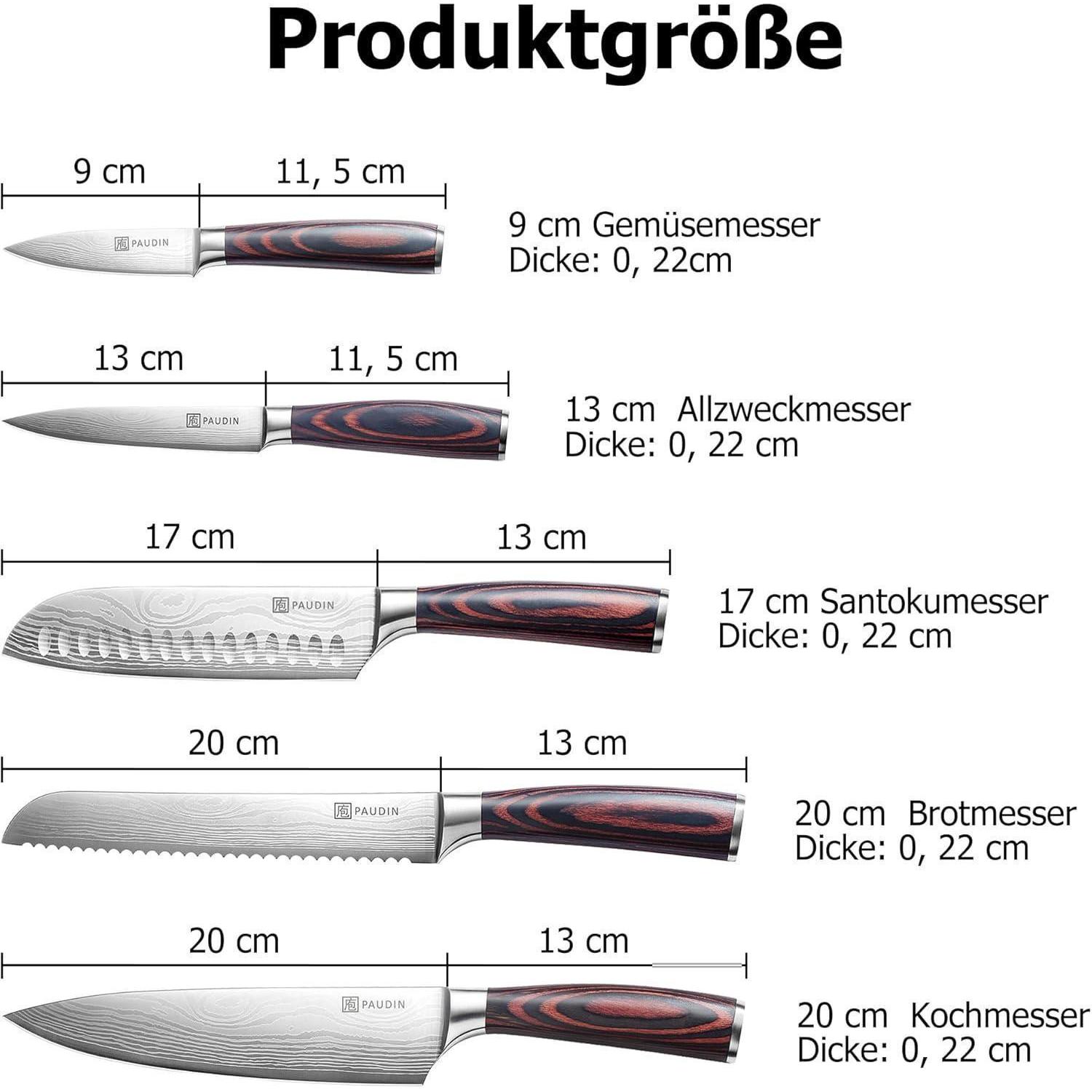Das PAUDIN Küchenmesser Set besteht aus 5 hochwertigen Carbon-Edelstahlmessern, die ein Must-Have für jede Küche sind. Das Set beinhaltet ein 20 cm Kochmesser, ein 20 cm Santokumesser, ein 13 cm Allzweckmesser, ein 20 cm Brotmesser und ein 9 cm Gemüsemesser. Diese umfassende Zusammenstellung bietet Ihnen die perfekte Auswahl für alle Schneidaufgaben in der Küche.