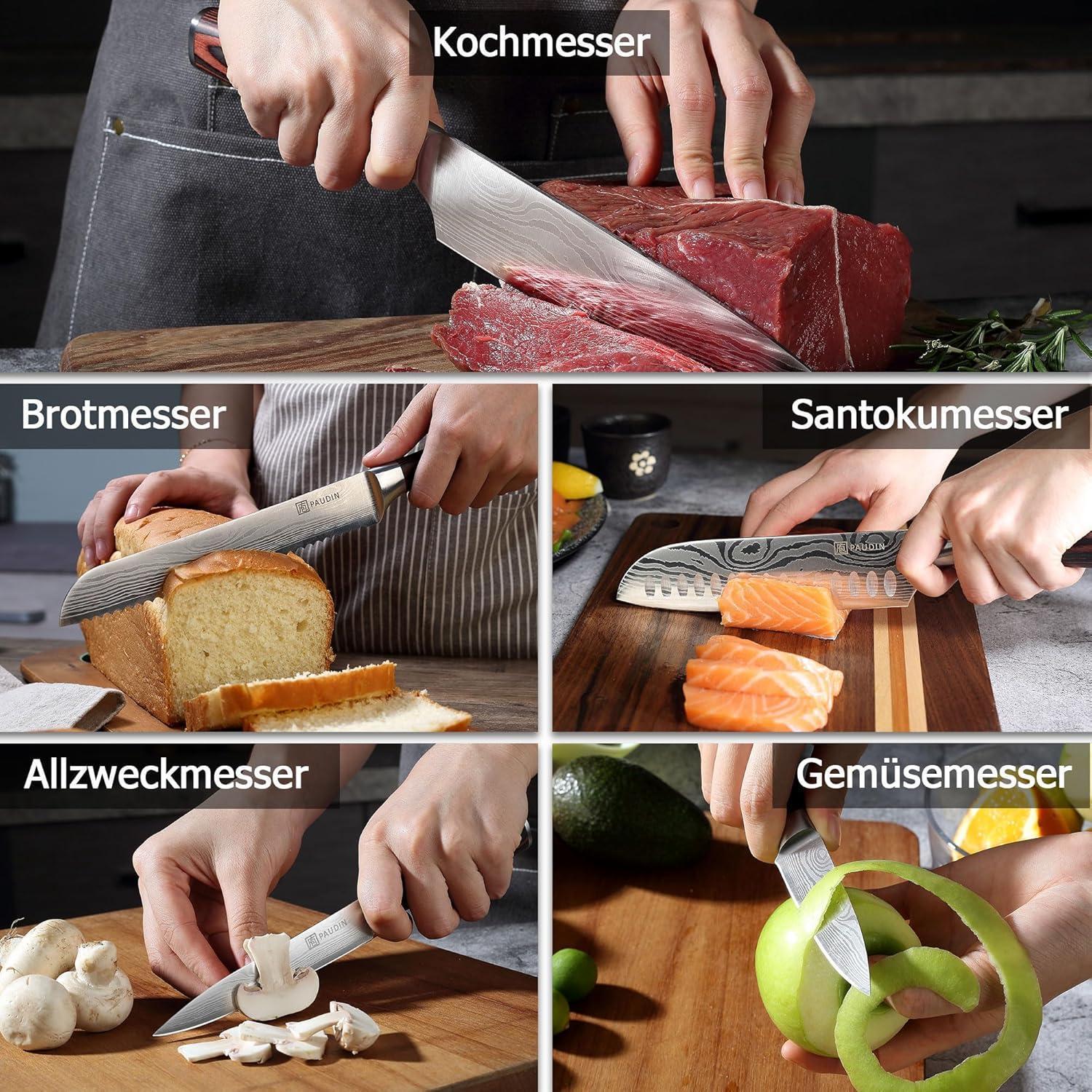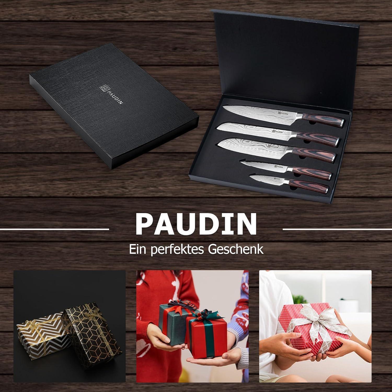 Der Griff der Messer besteht aus robustem Pakkawood, einer Holzart, die für ihre Festigkeit und Haltbarkeit bekannt ist. Das ergonomische Design sorgt für einen rutschfesten und komfortablen Griff, der Ihnen beim Schneiden oder Schneiden von Lebensmitteln Sicherheit und Vertrauen bietet. Das PAUDIN Küchenmesser Set ist nicht nur funktional, sondern auch ästhetisch ansprechend und eine großartige Geschenkidee für Männer, die gerne kochen.