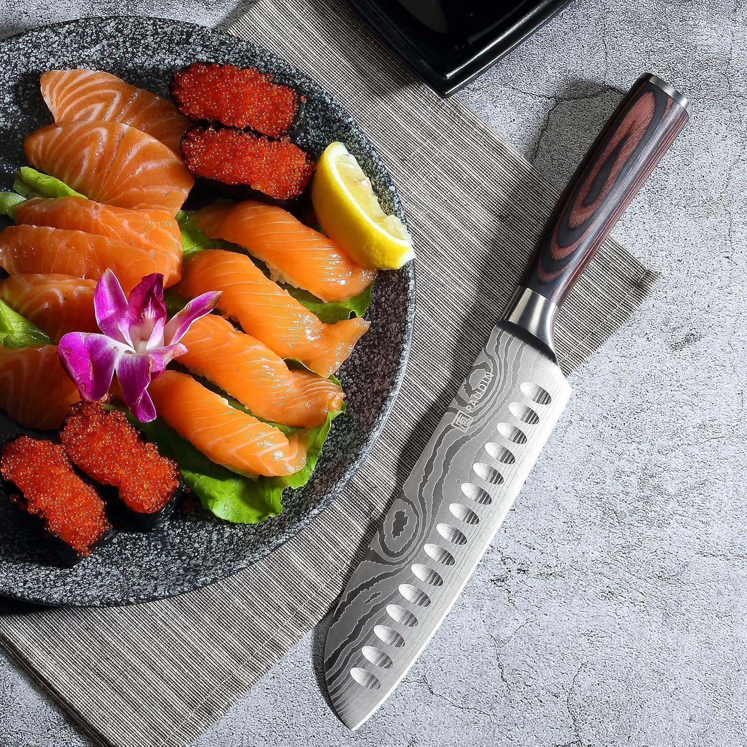 Alle Messer in diesem Set sind aus hochwertigem, rostfreiem Edelstahl mit hohem Kohlenstoffanteil gefertigt, was ihnen eine ausgezeichnete Härte, Abriebfestigkeit und Formbeständigkeit verleiht. Die 5cr15mov Stahllegierung sorgt dafür, dass die Klingen lange Zeit scharf bleiben und eine lange Lebensdauer haben. Jedes Messer verfügt über eine professionelle Satin-Finish-Oberfläche für optimale Schärfe.