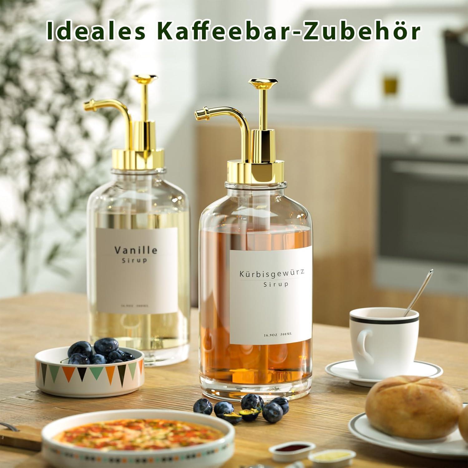 Kaffeesirup Pumpspender für Kaffee Bar Zubehör: Das Kaffee Pumpspender Set ist ein Must-Have für jede Kaffeebar oder den Haushalt. Enthalten sind 4 hochwertige Glassirupflaschen mit je 500ml Fassungsvermögen, 4 Metall-Stil PVC Pumpen, 48 voreingestellte Etiketten, 10 DIY Blanko-Etiketten und 1 zusammenklappbaren lebensmittelechten Silikontrichter.