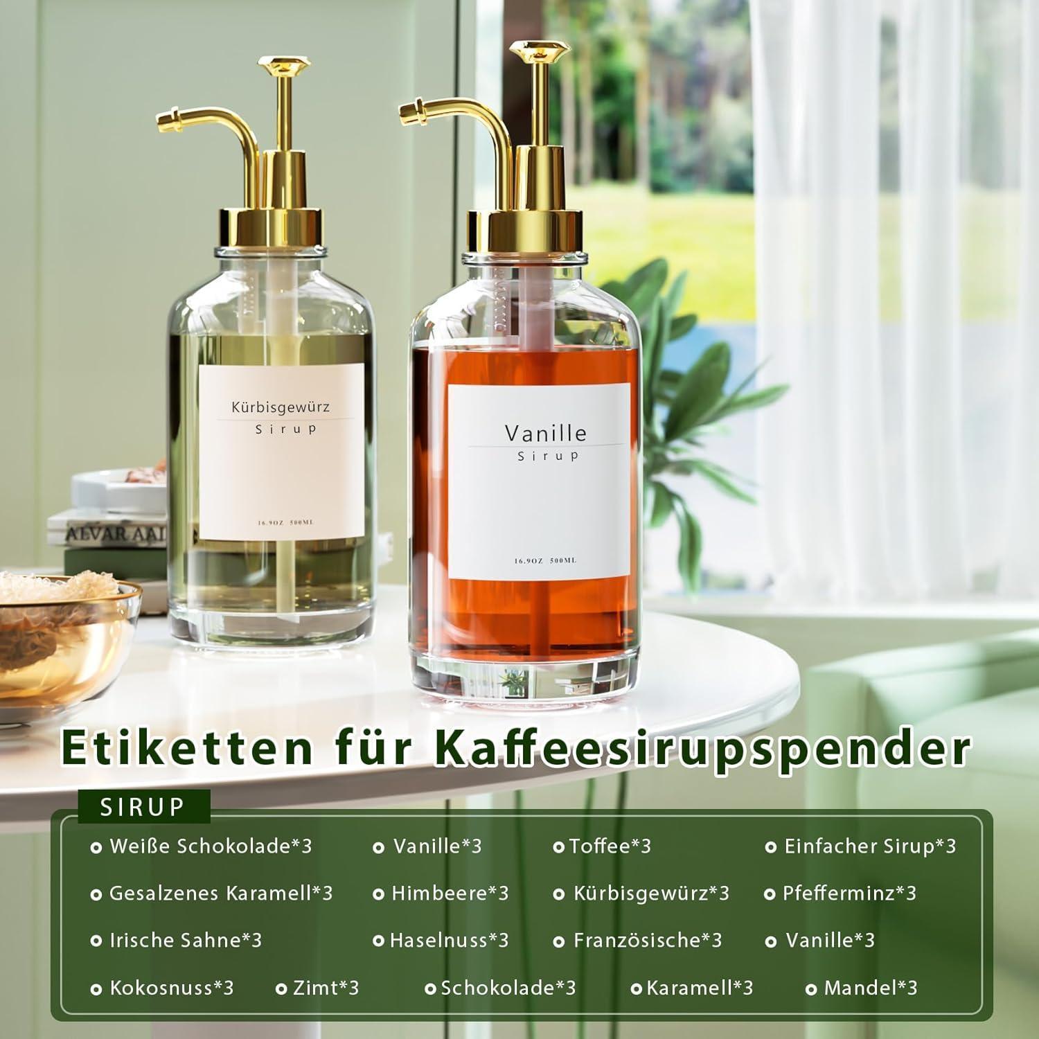 Wasserfestes ölbeständiges Etikett: Das Sirupspender-Set kommt mit voreingestellten Etiketten zur Organisation Ihrer Sirupe und 10 leeren Etiketten für individuelle Beschriftungen. Halten Sie Ihre Kaffeebar übersichtlich und ansprechend.