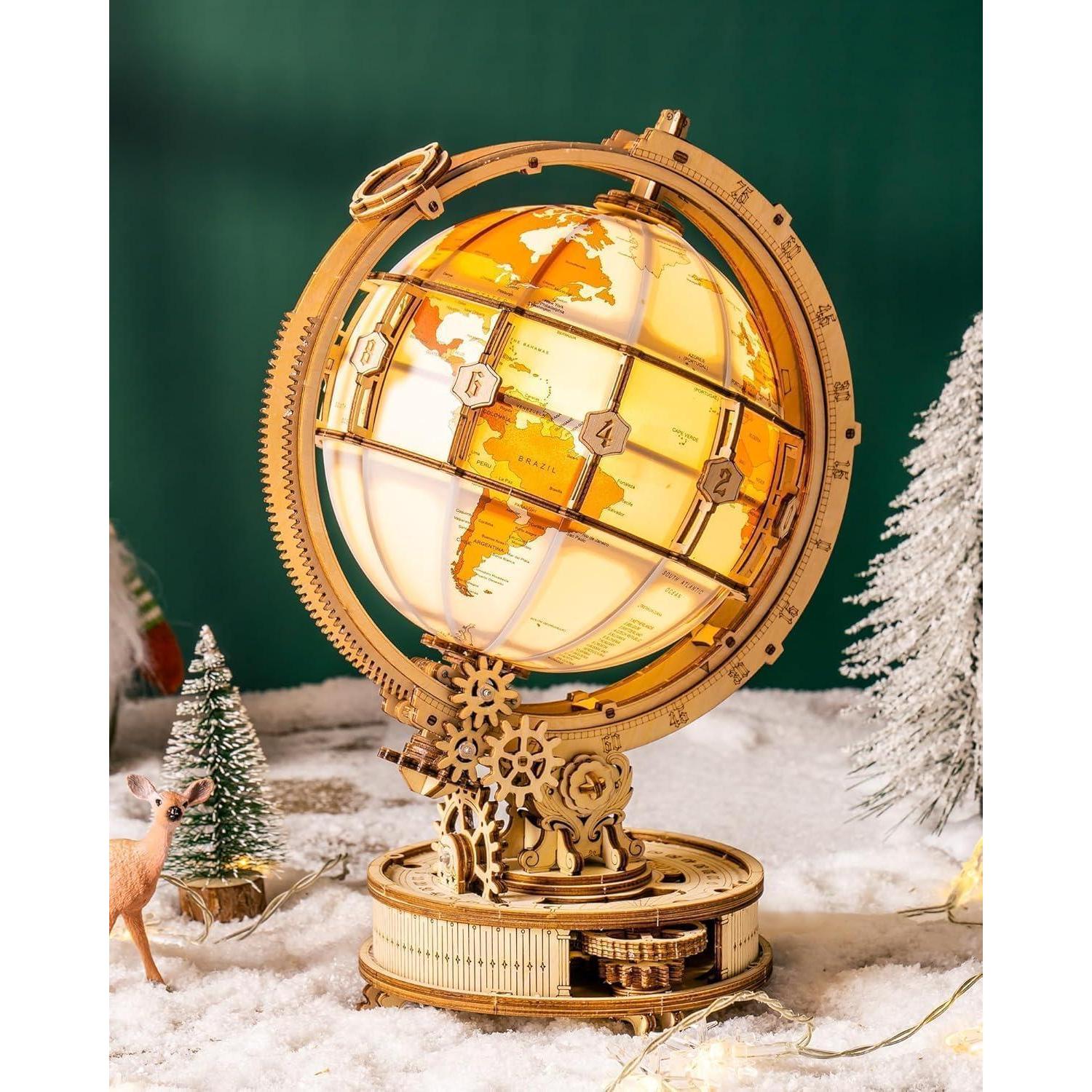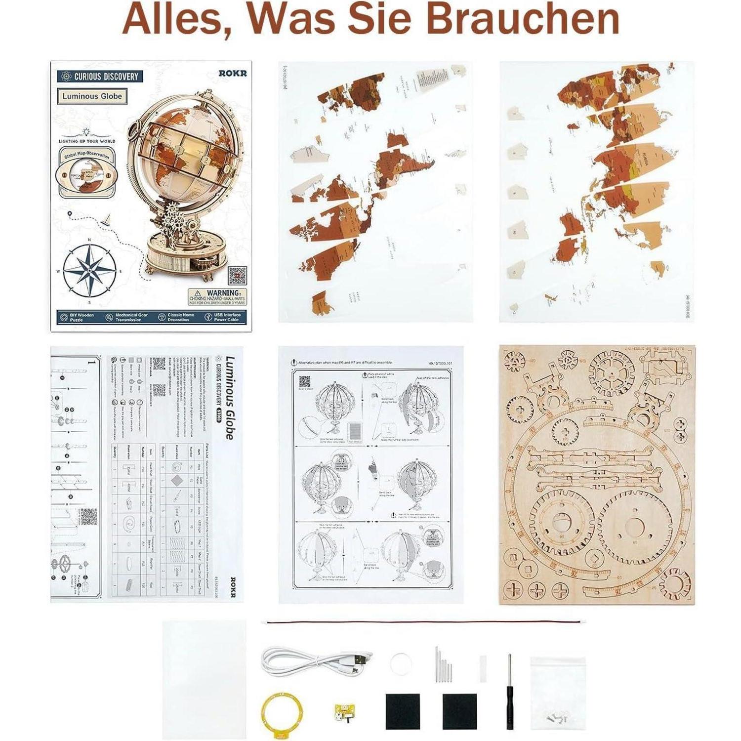 Erkunden Sie die Schönheit der Welt im Dunkeln, wenn Sie Ihre selbstgebaute Nachtlichtkugel beleuchten. Tauchen Sie ein in die Faszination der Geografie und Mechanik mit dem ROKR Holzpuzzle.