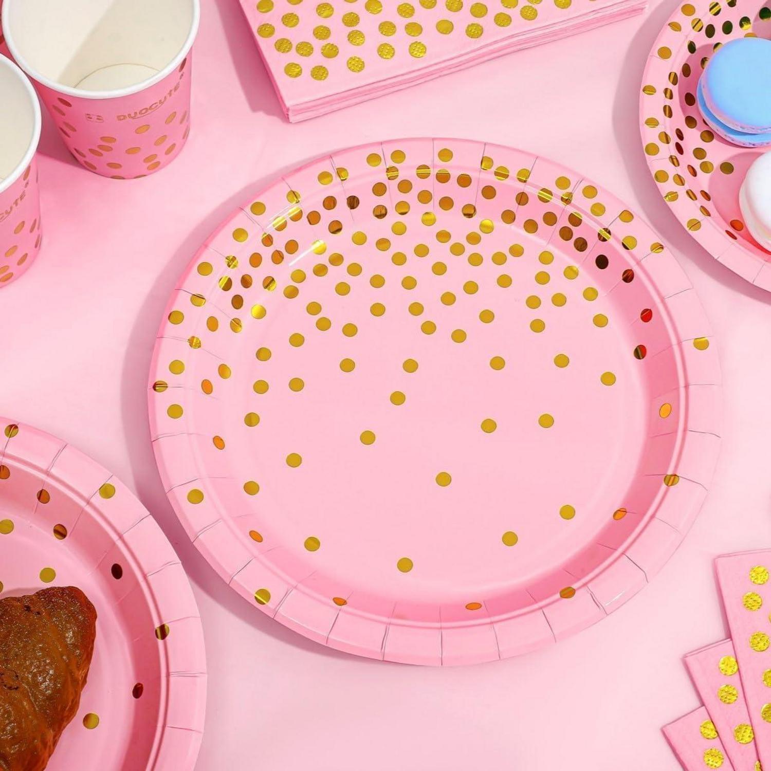 ROSA GOLDFOLIEPUNKT Design: Diese Partyzubehör-Packung wurde mit rosa Hintergrund und goldenem Folien-Tupfenmuster entworfen. Die rosa Pappteller und Tassen sind alle mit einem attraktiven goldenen Folienpunkt versehen. Verleiht jeder Party einen eleganten, modernen Touch. Perfekte Wahl für eine rosa und goldene Themenparty.