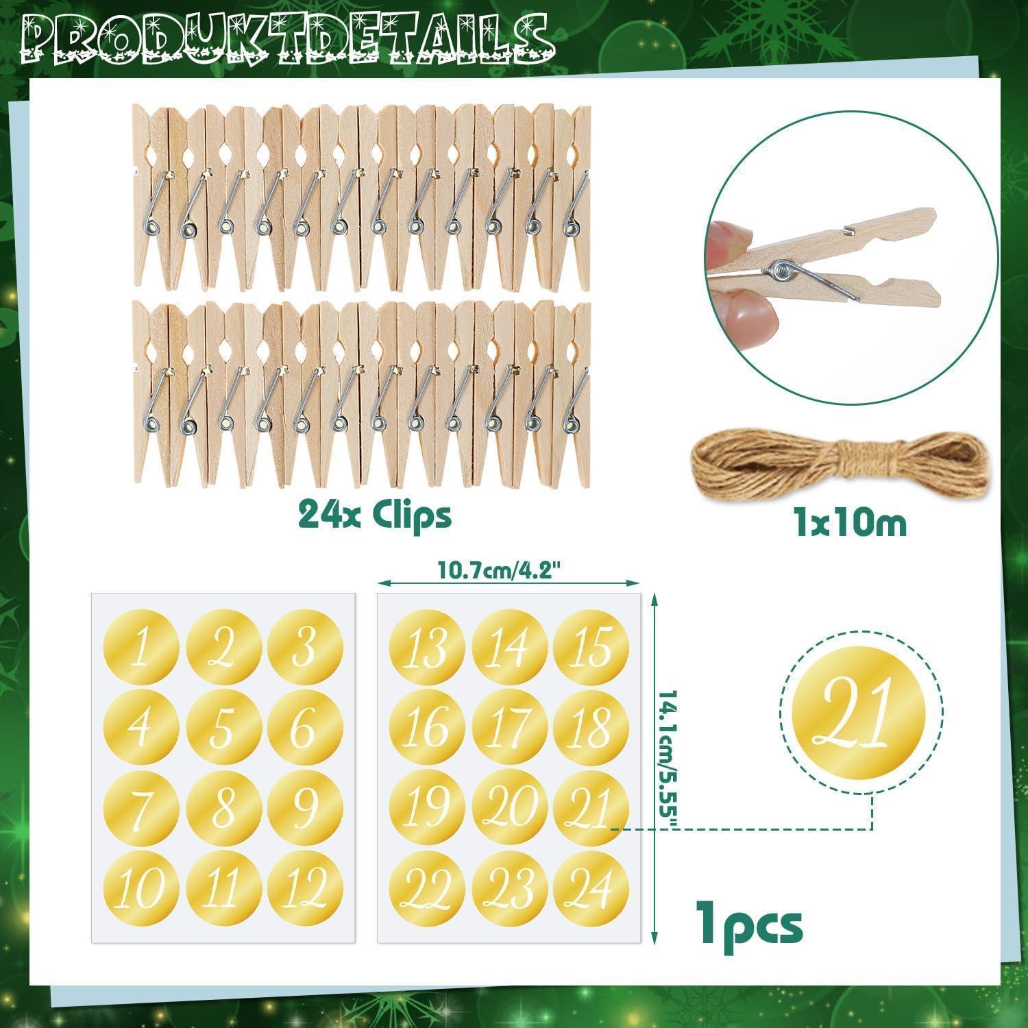 Das Set enthält 24 glitzernde Rubbelkarten mit verschiedenen weihnachtlichen Motiven, 24 Rubbelaufkleber, Adventskalender Zahlen Aufkleber, Holzklammern und eine Hanf Kordel zum Aufhängen der Karten. Mit diesem DIY Adventskalender Set haben Sie alles, um einzigartige und festliche Überraschungen zu gestalten.