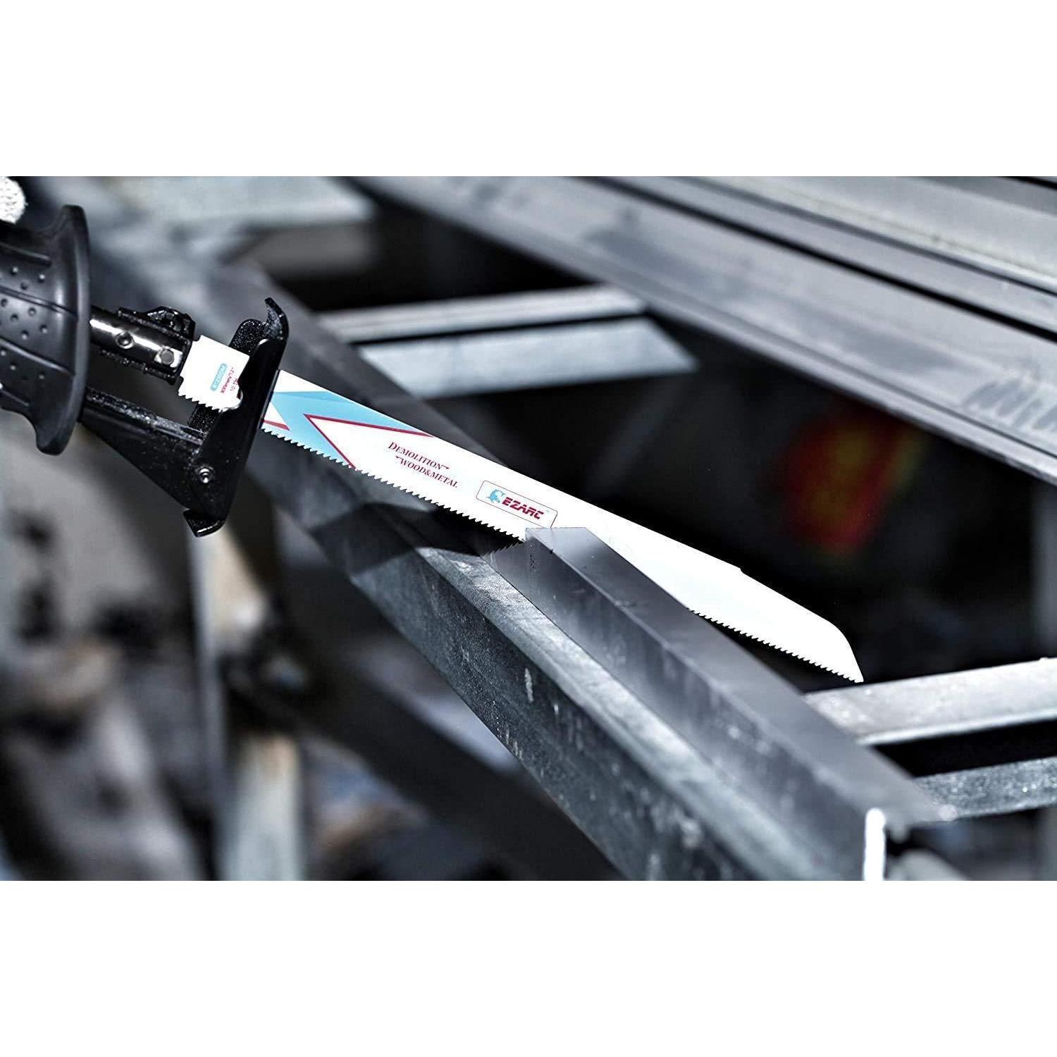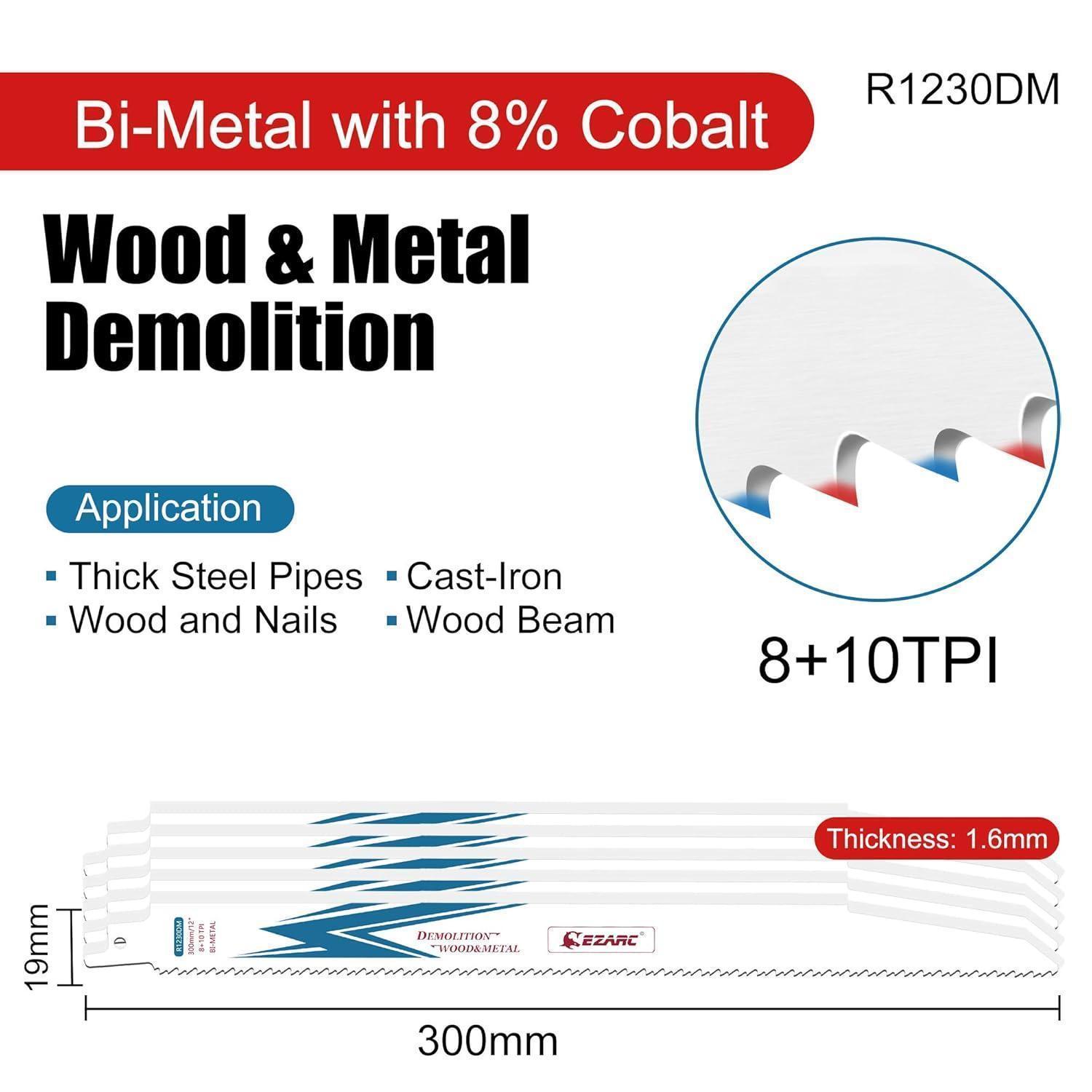 Die EZARC Säbelsägeblätter R1230DM sind speziell entwickelt, um sowohl Holz als auch Metall mühelos zu durchtrennen. Mit einem 1/2" (13mm) Schaft passen sie auf eine Vielzahl von Säbelsägen, darunter Modelle von Dewalt, Bosch, Hitachi, Flex, Makita, Metabo, skil und mehr.