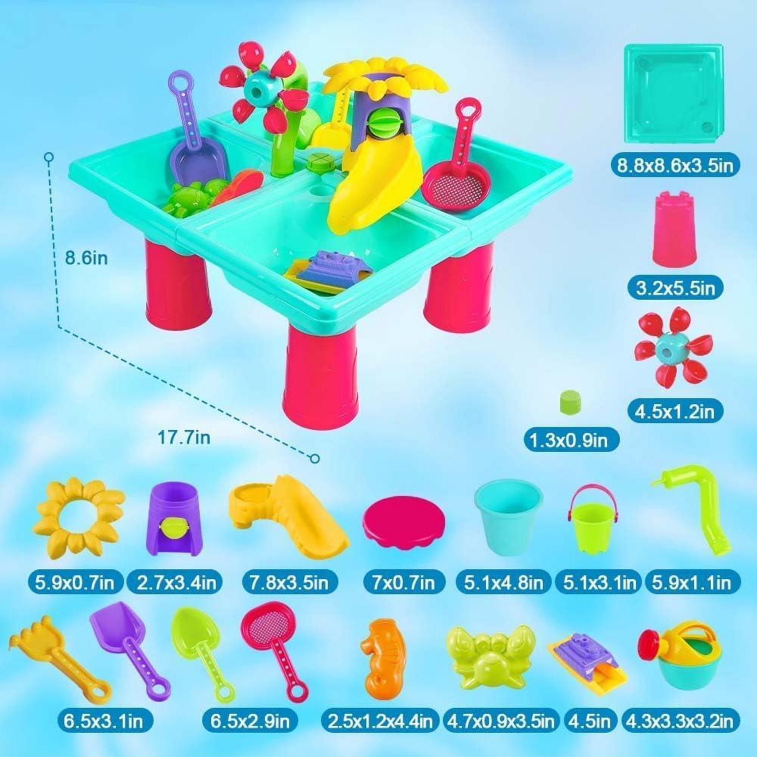 Der Wassertisch wird mit 25 Zubehörteilen geliefert, darunter Eimer, Baumturm-Wasserfall, Windmühle und vieles mehr, um das Spielerlebnis zu bereichern. Kinder können mit verschiedenen Formen Abdrücke in den Sand machen, sieben, gießen, spritzen und bauen - alles an einem Ort!