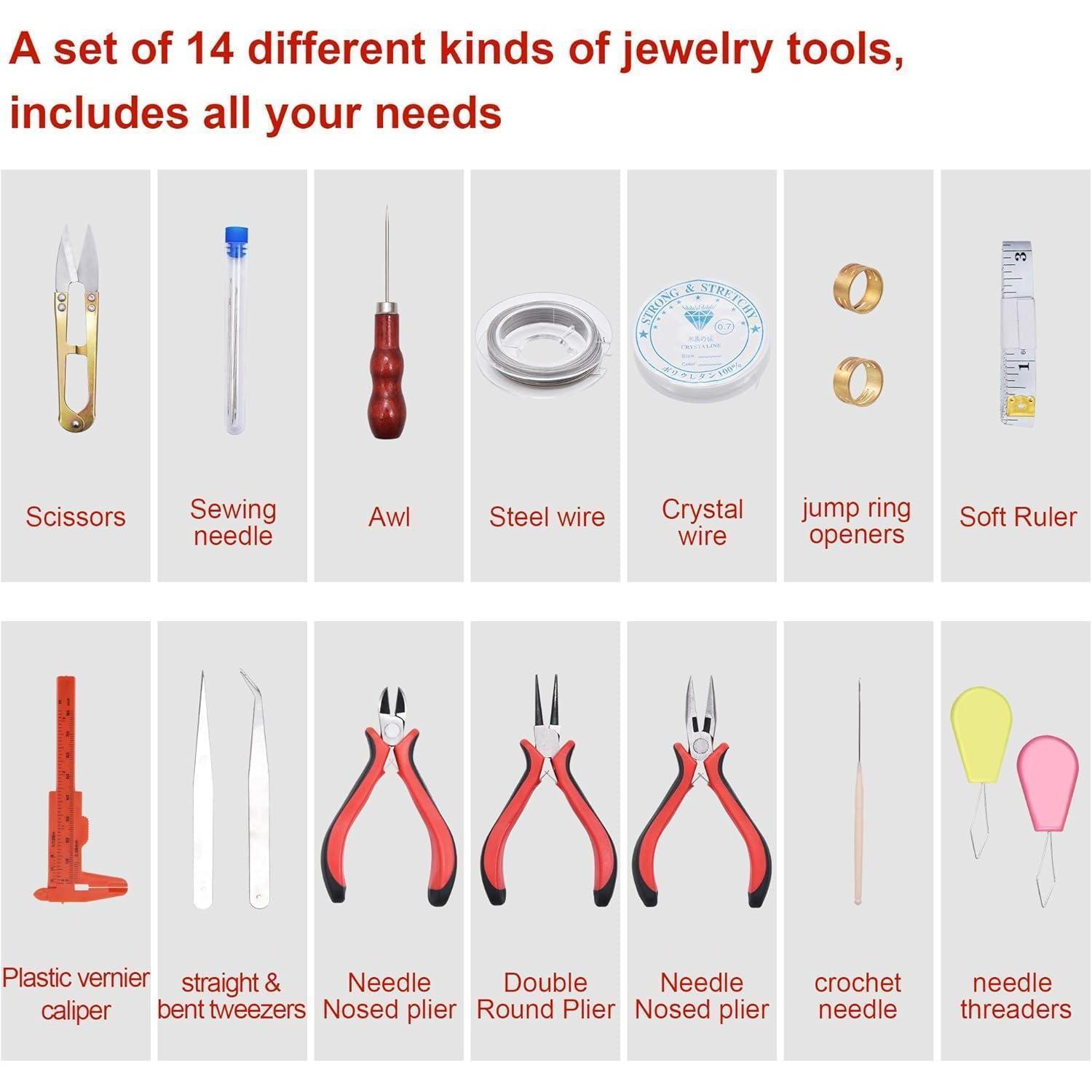 Zusätzlich zu den Zangen enthält das Set eine Vielzahl von Zubehörteilen, darunter silberfarbenen Stahldraht, elastische Kristalllinie, Nadeln, Pinzetten, Scheren, Maßband, Nadeleinfädler, Häkelnadel und vieles mehr. Mit diesem umfassenden Set sind Ihrer Kreativität keine Grenzen gesetzt.