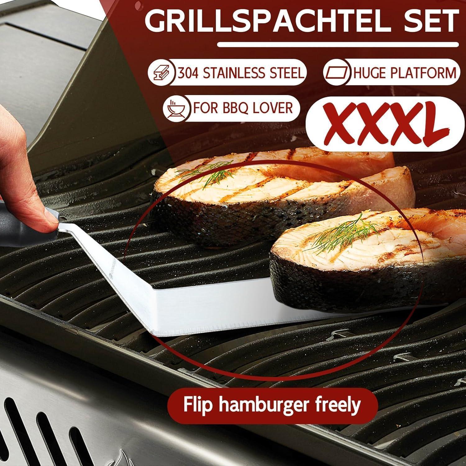 SchwabenBurger Barbecue Burger Set ist das ultimative Grillwerkzeug, das Ihre BBQ-Erlebnisse auf ein neues Level hebt. Der XXXL Plancha Spachtel mit seiner großen Oberfläche von 15cm*13cm ermöglicht es Ihnen, eine Vielzahl von Lebensmitteln mühelos zu wenden, ohne dass etwas herunterfällt. Hergestellt durch ein einteiliges Gussverfahren, bietet der Grillspatel eine stabile Struktur, die auch bei starkem Druck nicht verbiegt.